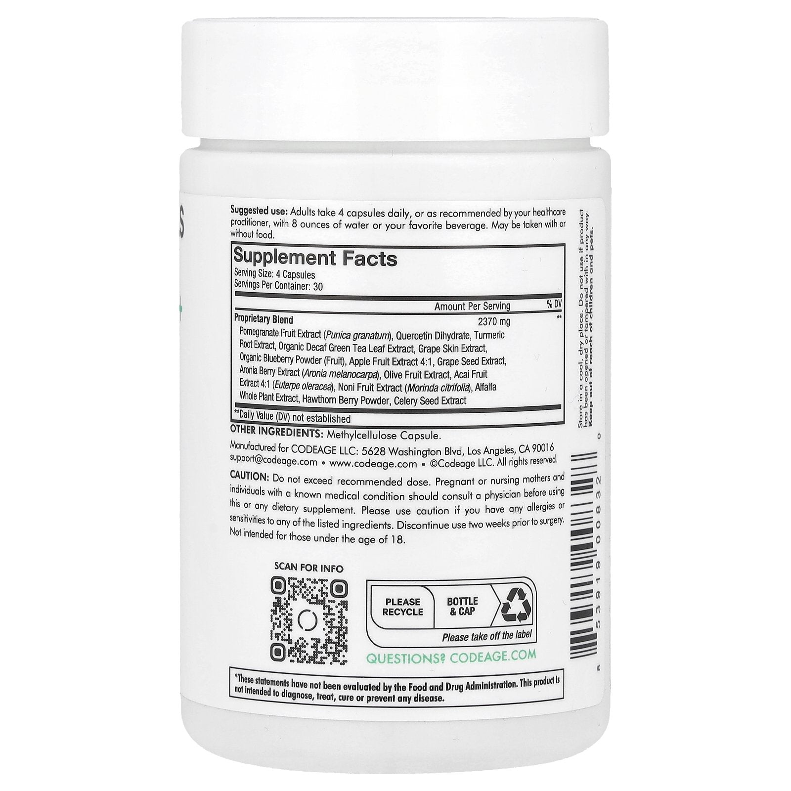 Proprietary Blend Pomegranate Fruit Extract (Punica granatum), Quercetin Dihydrate, Turmeric Root Extract, Organic Decaf Green Tea Leaf Extract, Grape Skin Extract, Organic Blueberry Powder (Fruit), Apple Fruit Extract 4:1, Grape Seed Extract, Aronia Berry Extract (Aronia melanocarpa), Olive Fruit Extract, Acai Fruit Extract 4:1 (Euterpe oleracea), Noni Fruit Extract (Morinda citrifolia), Alfalfa Whole Plant Extract, Hawthorn Berry Powder, Celery Seed Extract |