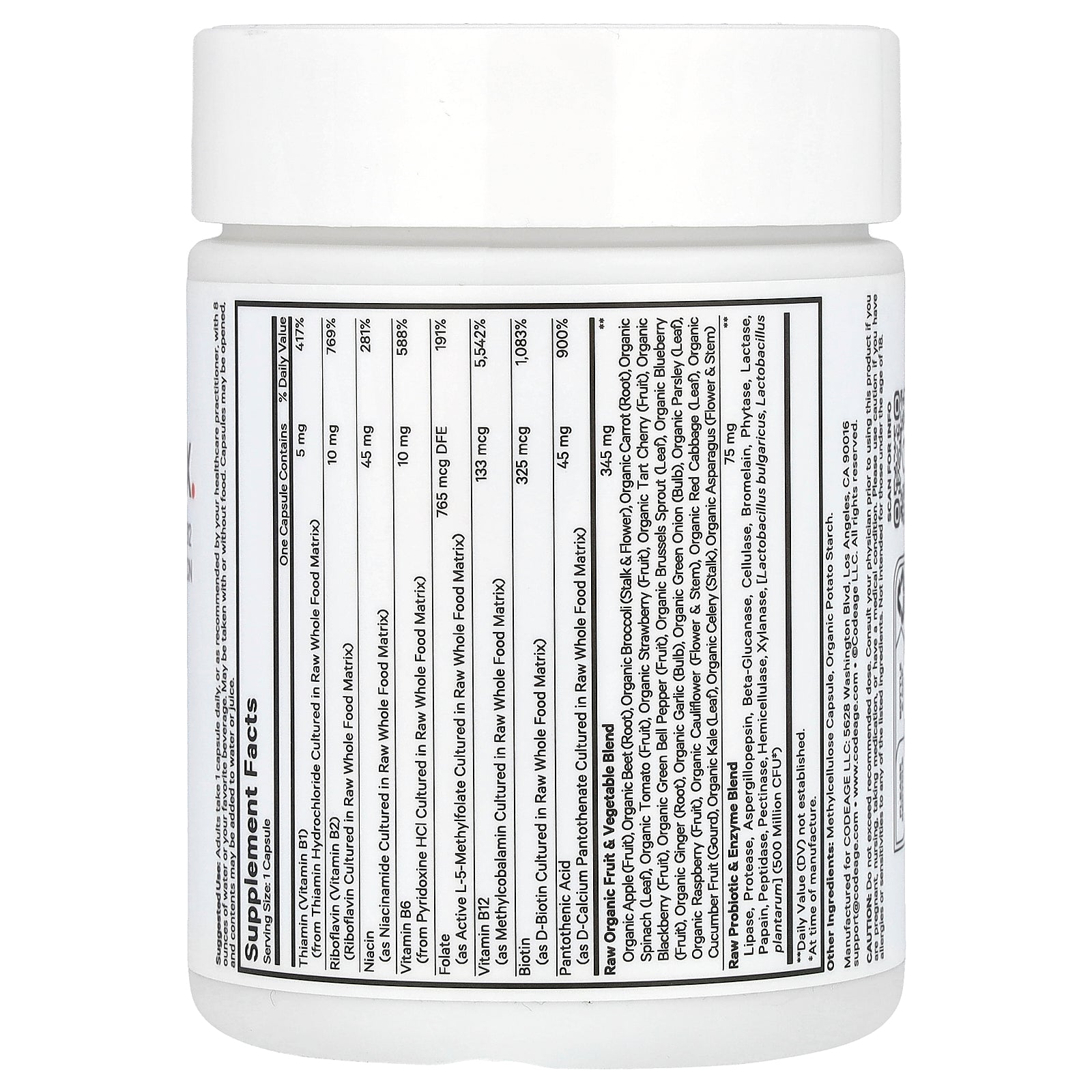 Codeage Raw Vitamin B-Complex is a comprehensive blend of 8 essential B vitamins, including Thiamin, Riboflavin, Niacin, Vitamin B6, Folate, Vitamin B12, Biotin, and Pantothenic Acid, all cultured in a unique raw whole food matrix to help promote their absorption.