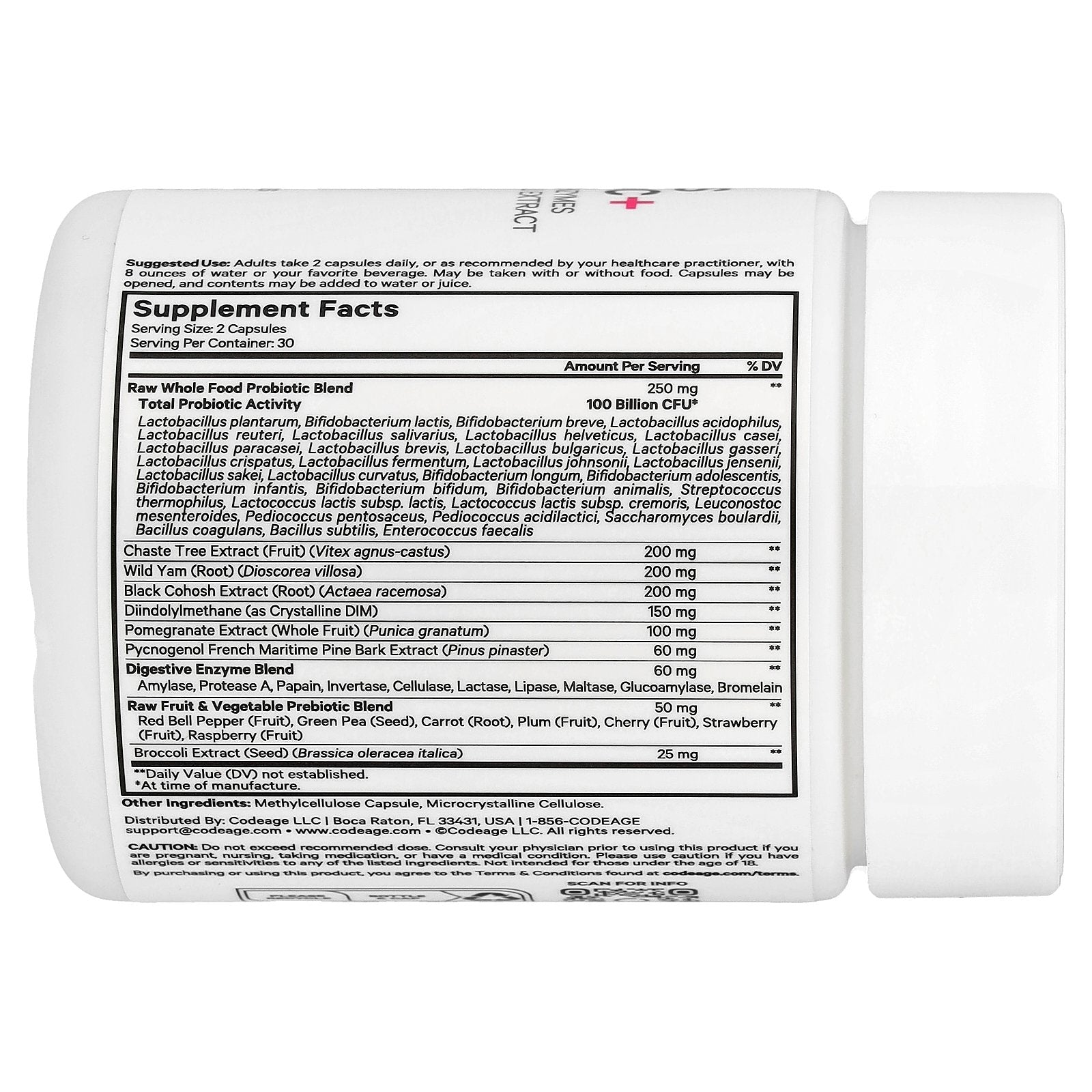 Codeage Raw Women's Probiotic+ delivers 100 billion CFUs of probiotics, prebiotics, and enzymes like lipase and protease. This formula is enhanced with chaste tree extract, wild yam, DIM, pomegranate, broccoli, black cohosh, and a comprehensive whole-food botanical blend of fruits.
