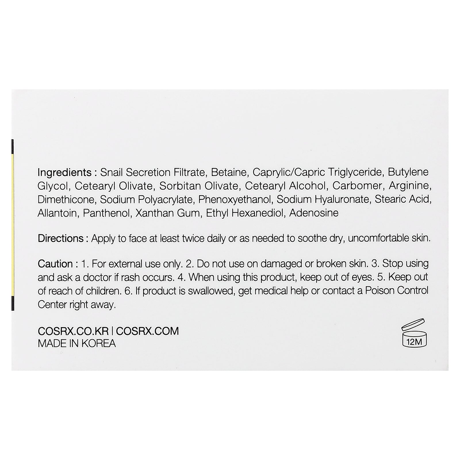 Snail secretion filtrate, betaine, caprylic/capric triglyceride, butylene glycol, cetearyl olivate, sorbitan olivate, cetearyl alcohol, carbomer, arginine, dimethicone, sodium polyacrylate, phenoxyethanol, sodium hyaluronate, stearic acid, allantoin, panthenol, xanthan gum, ethyl hexanediol, adenosine.