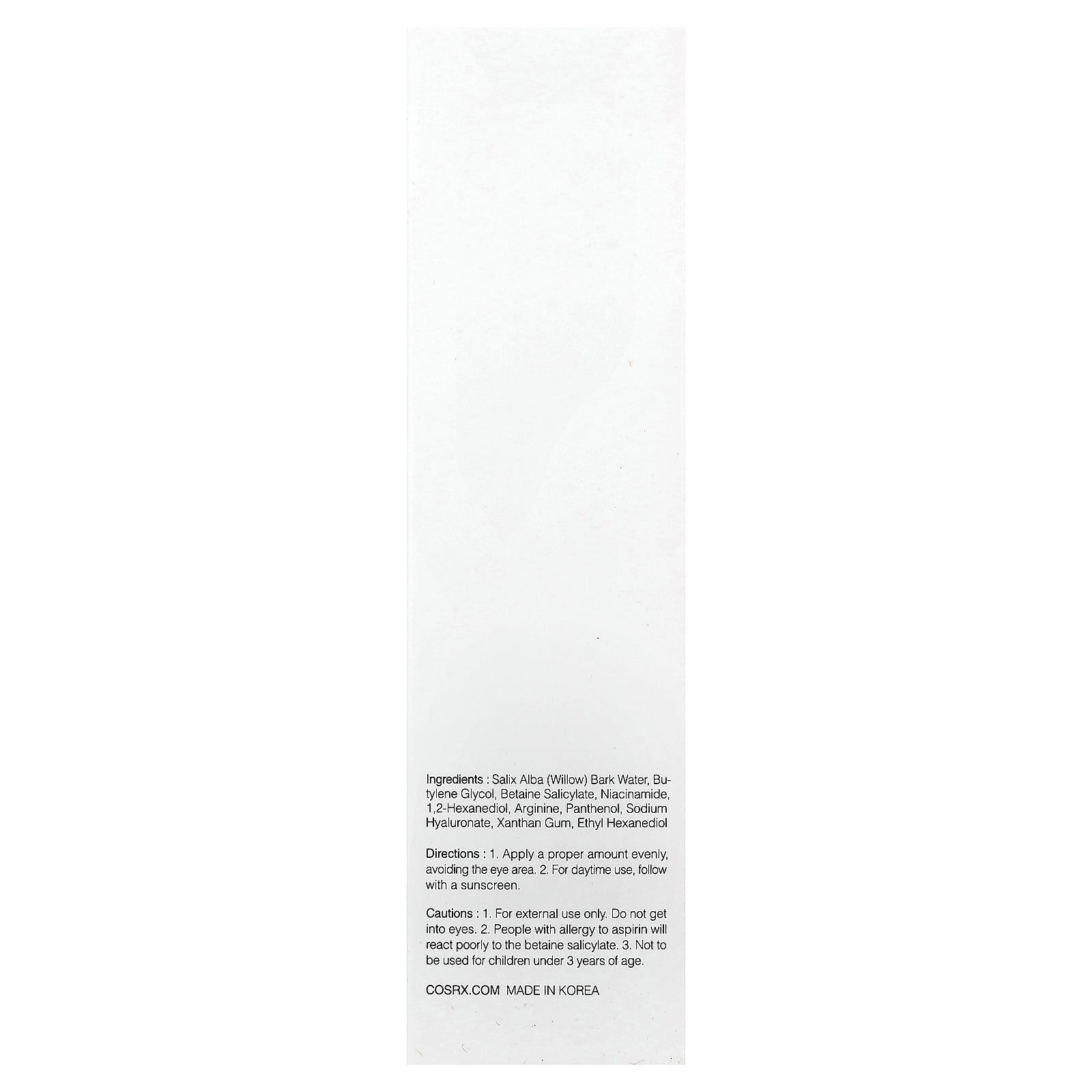 Salix alba (willow) bark water, butylene glycol, betaine salicylate, niacinamide, 1,2-hexanediol, arginine, panthenol, sodium hyaluronate, xanthan gum, ethyl hexanediol.