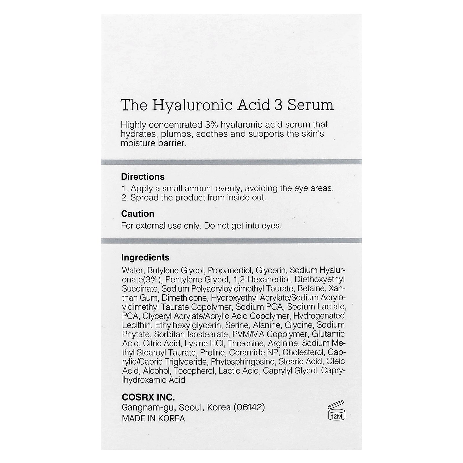 Highly concentrated 3% hyaluronic acid serum that hydrates, plumps, soothes and supports the skin's moisture barrier.