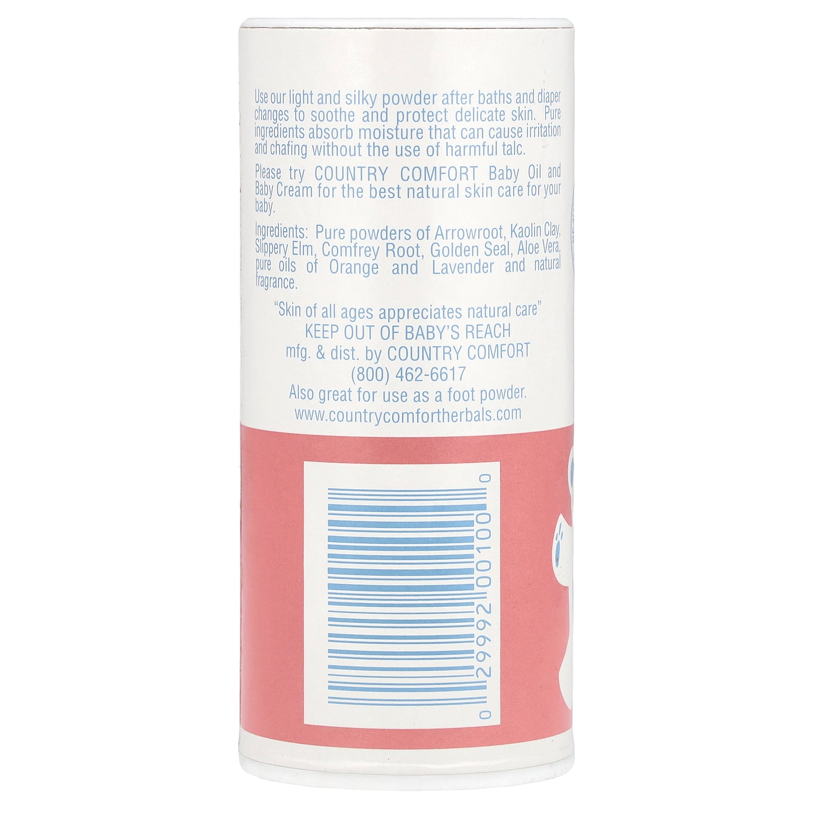 Pure powders of arrowroot, kaolin clay, slippery elm, comfrey root, golden seal, aloe vera, pure oils of orange and lavender and natural fragrance.