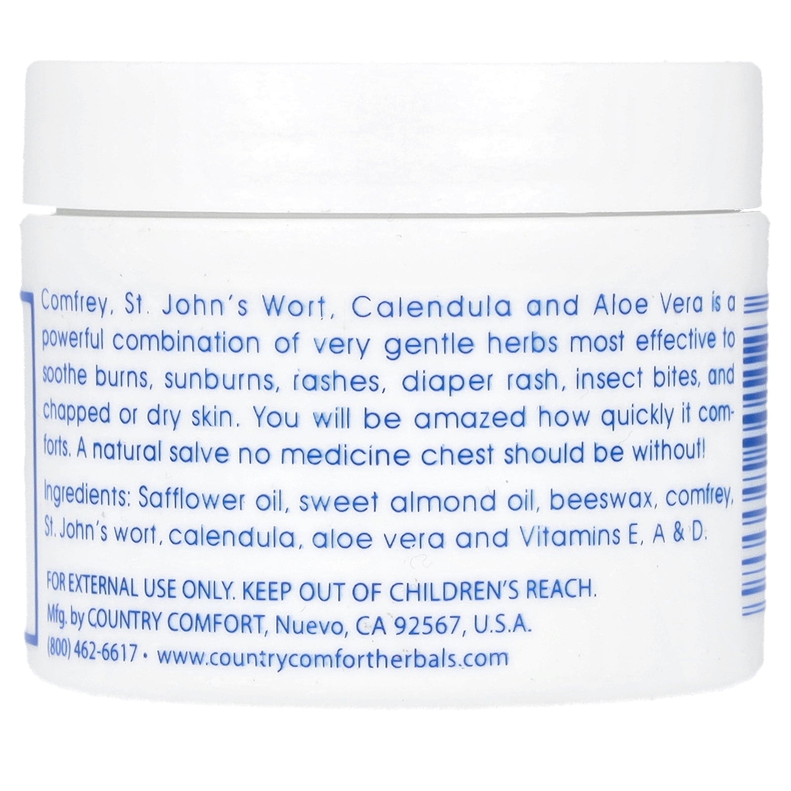 Comfrey, St. John's Wort, Calendula and Aloe Vera is a powerful combination of very gentle herbs most effective to soothe burns, sunburns, rashes, diaper rash, insect bites, and chapped or dry skin. You will be amazed how quickly it comforts. A natural salve no medicine chest should be without.