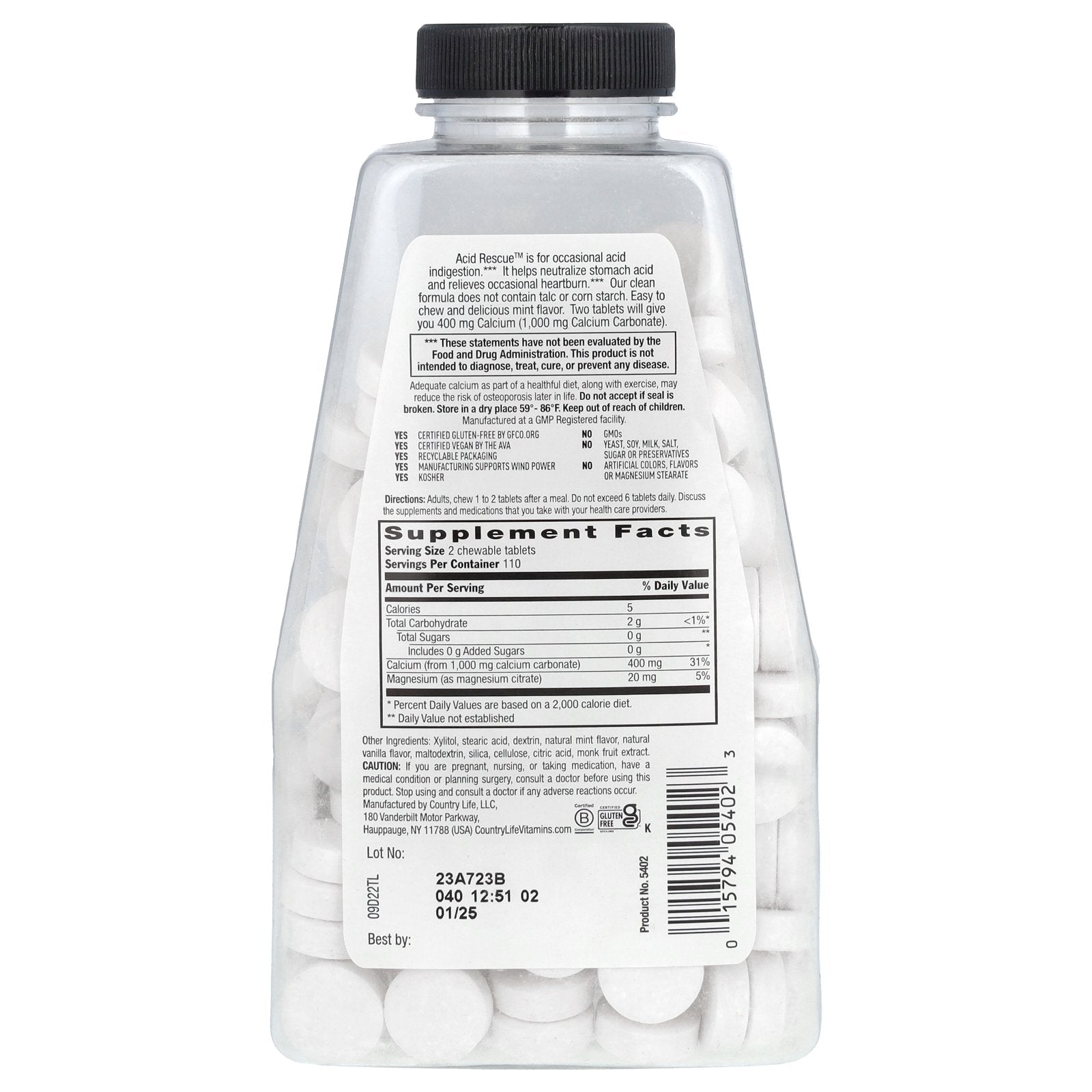 Acid Rescue™ is for occasional acid indigestion. It helps neutralize stomach acid and relieves occasional heartburn. Our clean formula does not contain talc or corn starch. Easy to chew and delicious mint flavor. Two tablets will give you 400 mg Calcium (1,000 mg Calcium Carbonate).