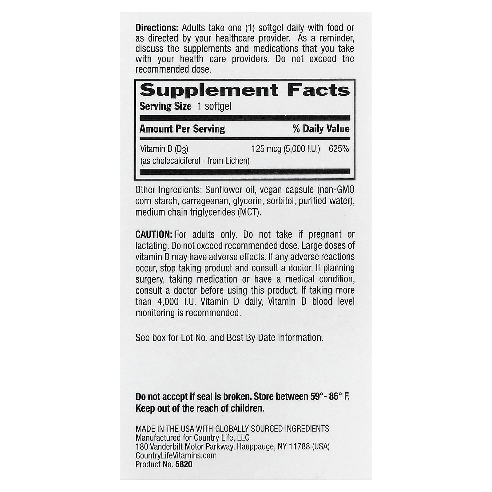 - 125 mcg (5,000 I.U.) of sustainably harvested Vitamin D3