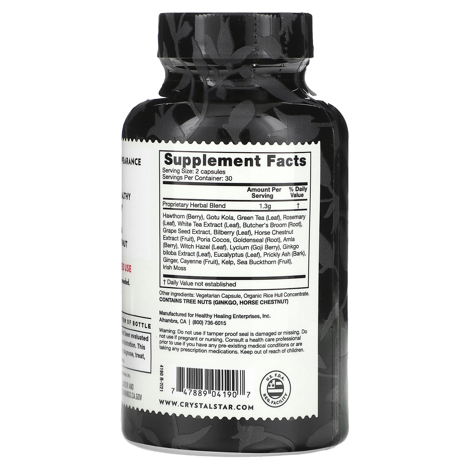 | Proprietary Herbal Blend Hawthorn (Berry), Gotu Kola, Green Tea (Leaf), Rosemary (Leaf), White Tea Extract (Leaf), Butcher's Broom (Root), Grape Seed Extract, Bilberry (Leaf), Horse Chestnut Extract (Fruit), Poria Cocos, Goldenseal (Root), Amla (Berry), Witch Hazel (Leaf), Lycium (Goji Berry), Ginkgo biloba Extract (Leaf), Eucalyptus (Leaf), Prickly Ash (Bark), Ginger, Cayenne (Fruit), Kelp, Sea Buckthorn (Fruit), Irish Moss |