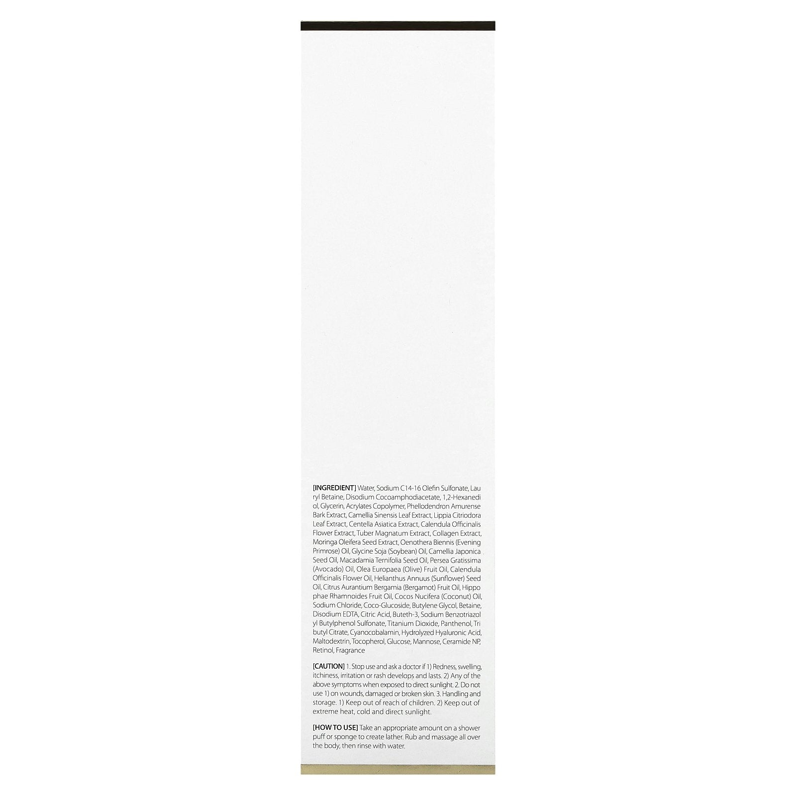 Water, sodium c14-16 olefin sulfonate, lauryl betaine, disodium cocoamphodiacetate, 1,2-hexanediol, glycerin, acrylates copolymer, phellodendron amurense bark extract, camellia sinensis leaf extract, lippia citriodora leaf extract, centella asiatica extract, calendula officinalis flower extract, tuber magnatum extract, collagen extract, moringa oleifera seed extract, oenothera biennis (evening primrose) oil, glycine soja (soybean) oil, camellia japonica seed oil, macadamia ternifolia seed oil, persea gratissima (avocado) oil, olea europaea (olive) fruit oil, calendula officinalis flower oil, helianthus annuus (sunflower) seed oil, citrus aurantium bergamia (bergamot) fruit oil, hippophae rhamnoides fruit oil, cocos nucifera (coconut) oil, sodium chloride, coco-glucoside, butylene glycol, betaine, disodium edta, citric acid, buteth-3, sodium benzotriazolyl butylphenol sulfonate, titanium dioxide, panthenol, tri butyl citrate, cyanocobalamin, hydrolyzed hyaluronic acid, maltodextrin, tocopherol, glucose, mannose, ceramide np, retinol, fragrance.