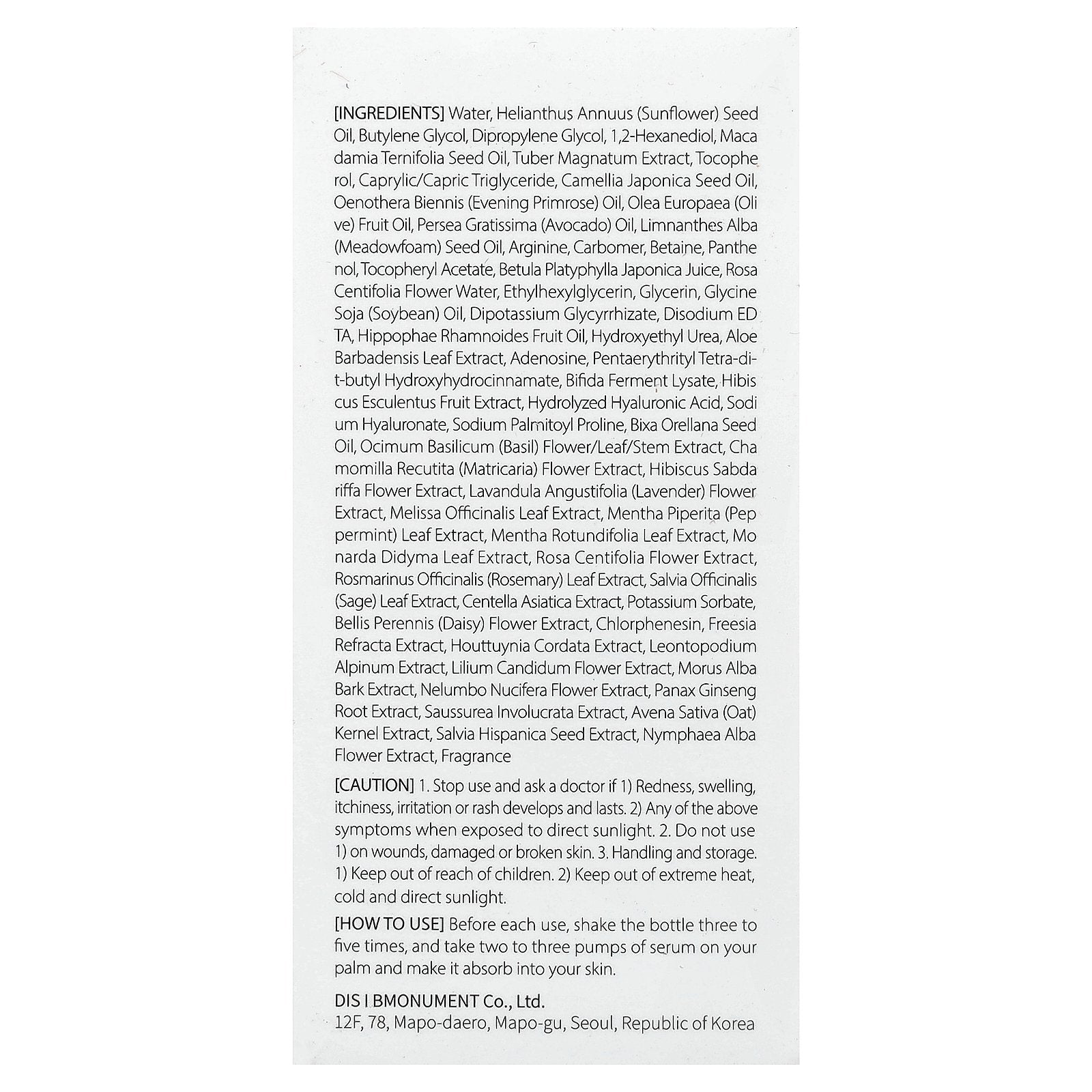 Water, helianthus annuus (sunflower) seed oil, butylene glycol, dipropylene glycol, 1,2-hexanediol, macadamia ternifolia seed oil, tuber magnatum extract, tocopherol, caprylic/capric triglyceride, camellia japonica seed oil, oenothera biennis (evening primrose) oil, olea europaea (olive) fruit oil, persea gratissima (avocado) oil, limnanthes alba (meadowfoam) seed oil, arginine, carbomer, betaine, panthenol, tocopheryl acetate, betula platyphylla japonica juice, rosa centifolia flower water, ethylhexylglycerin, glycerin, glycine soja (soybean) oil, dipotassium glycyrrhizate, disodium edta, hippophae rhamnoides fruit oil, hydroxyethyl urea, aloe barbadensis leaf extract, adenosine, pentaerythrityl tetra-di- t-butyl hydroxyhydrocinnamate, bifida ferment lysate, hibis cus esculentus fruit extract, hydrolyzed hyaluronic acid, sodium hyaluronate, sodium palmitoyl proline, bixa orellana seed oil, ocimum basilicum (basil) flower/leaf/stem extract, chamomilla recutita (matricaria) flower extract, hibiscus sabdariffa flower extract, lavandula angustifolia (lavender) flower extract, melissa officinalis leaf extract, mentha piperita (peppermint) leaf extract, mentha rotundifolia leaf extract, monarda didyma leaf extract, rosa centifolia flower extract, rosmarinus officinalis (rosemary) leaf extract, salvia officinalis (sage) leaf extract, centella asiatica extract, potassium sorbate, bellis perennis (daisy) flower extract, chlorphenesin, freesia refracta extract, houttuynia cordata extract, leontopodium alpinum extract, lilium candidum flower extract, morus alba bark extract, nelumbo nucifera flower extract, panax ginseng root extract, saussurea involucrata extract, avena sativa (oat) kernel extract, salvia hispanica seed extract, nymphaea alba flower extract, fragrance.