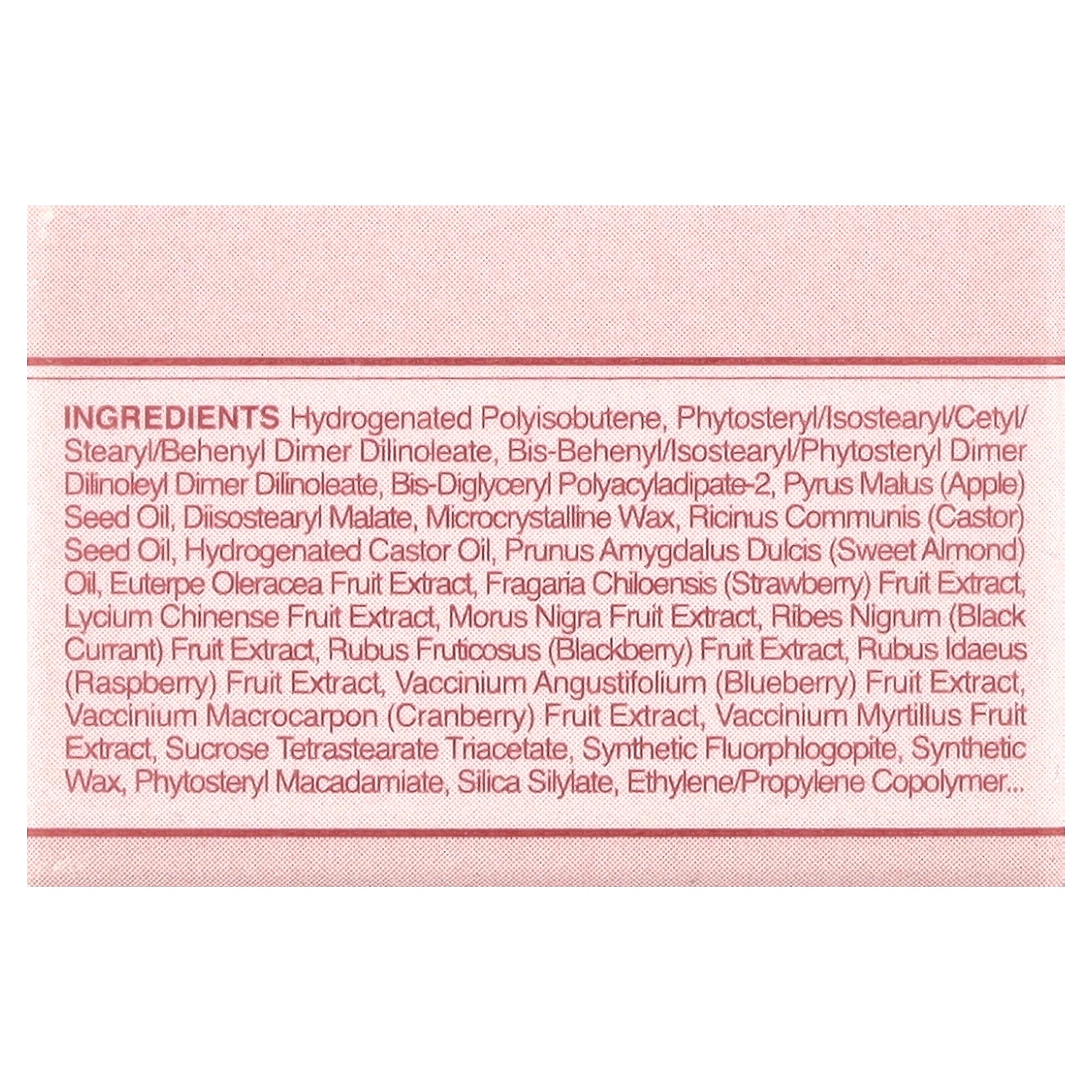 Hydrogenated polyisobutene, phytosteryl/isostearyl/cetyl/ stearyl/behenyl dimer dilinoleate, bis-behenyl/isostearyl/phytosteryl dimer dilinoleyl dimer dilinoleate, bis-diglyceryl polyacyladipate-2, pyrus malus (apple) seed oil, diisostearyl malate, microcrystalline wax, ricinus communis (castor) seed oil, hydrogenated castor oil, prunus amygdalus dulcis (sweet almond) oil, euterpe oleracea fruit extract, fragaria chiloensis (strawberry) fruit extract, lycium chinense fruit extract, morus nigra fruit extract, ribes nigrum (black currant) fruit extract, rubus fruticosus (blackberry) fruit extract, rubus idaeus (raspberry) fruit extract, vaccinium angustifolium (blueberry) fruit extract, vaccinium macrocarpon (cranberry) fruit extract, vaccinium myrtillus fruit extract, sucrose tetrastearate triacetate, synthetic fluorphlogopite, synthetic wax, phytosteryl macadamiate, silica silylate, ethylene/propylene copolymer, polyglyceryl-2 triisostearate, caprylyl glycol, glyceryl caprylate, polyglyceryl-2 diisostearate, water, butylene glycol, ethylhexylglycerin, phenoxyethanol, fragrance(parfum), benzyl alcohol, limonene, titanium dioxide (ci 77891), iron oxides (ci 77491), iron oxides (ci 77492), red 33 lake (ci 17200), red 7 lake (ci 15850) , red 27 (ci 45410), blue 1 lake (ci 42090).