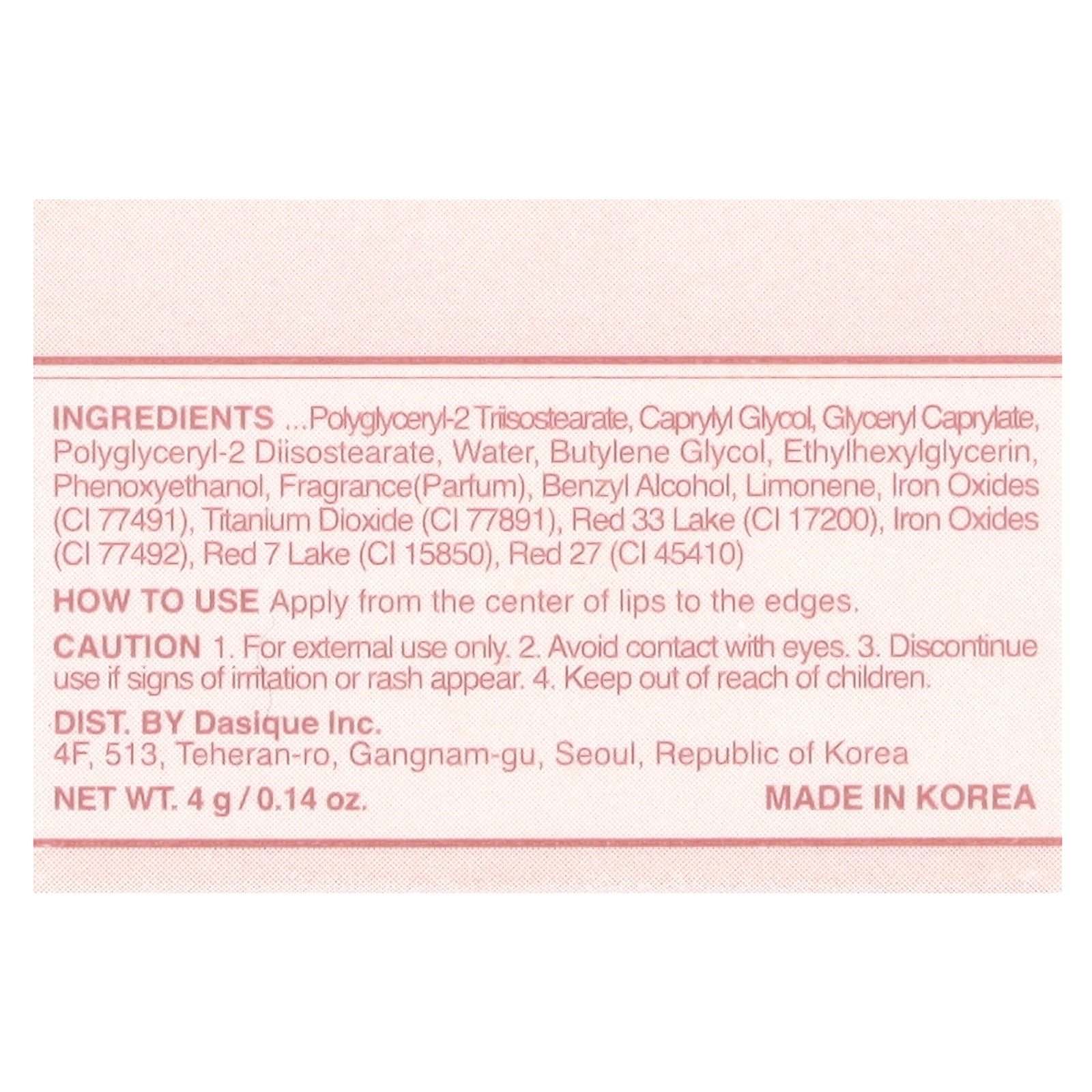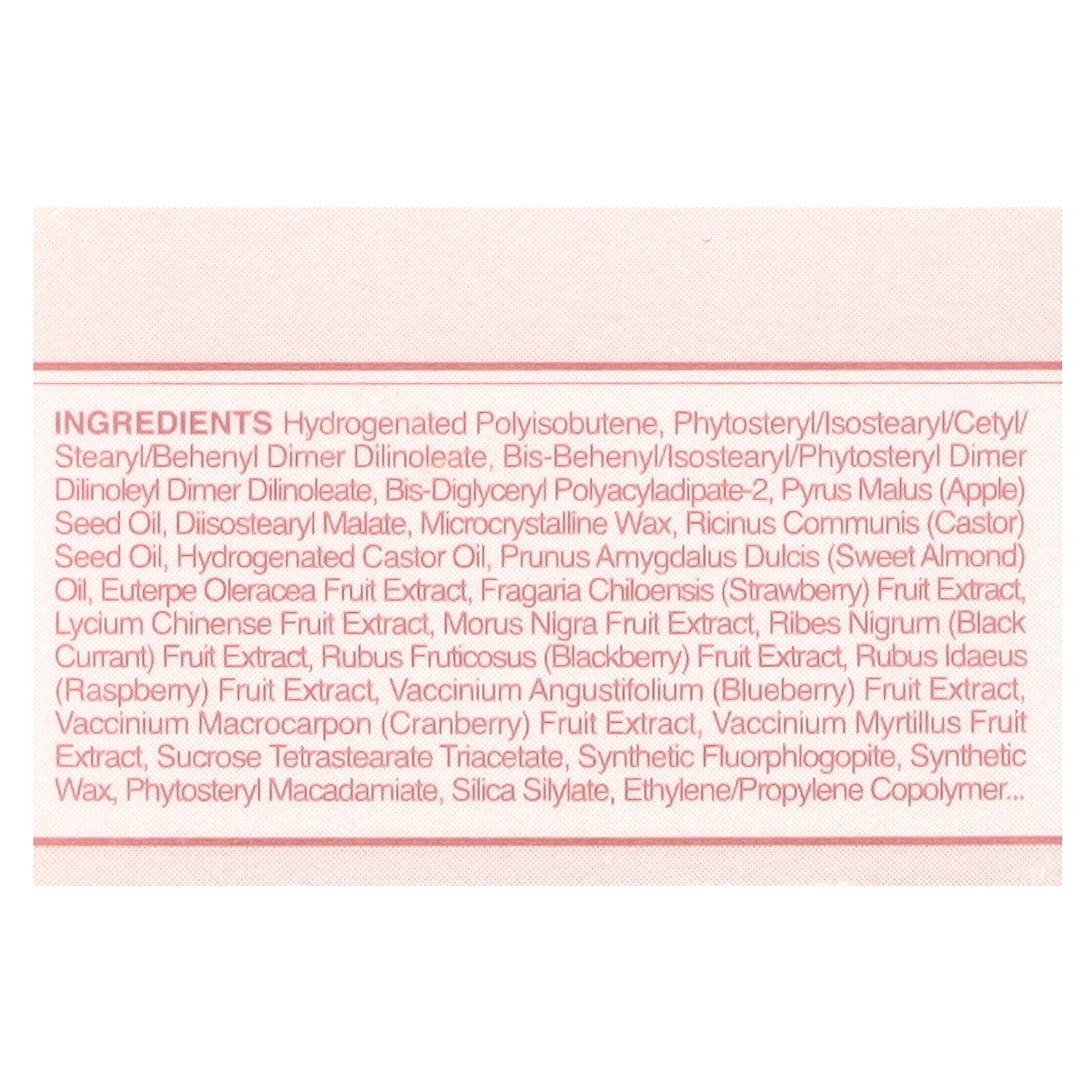 Hydrogenated polyisobutene, phytosteryl/isostearyl/cetyl/stearyl/behenyl dimer dilinoleate, bis-behenyl/isostearyl/phytosteryl dimer dilinoleyl dimer dilinoleate, bis-diglyceryl polyacyladipate-2, pyrus malus (apple) seed oil, diisostearyl malate, microcrystalline wax, ricinus communis (castor) seed oil, hydrogenated castor oil, prunus amygdalus dulcis (sweet almond) oil, euterpe oleracea fruit extract, fragaria chiloensis (strawberry) fruit extract, lycium chinense fruit extract, morus nigra fruit extract, ribes nigrum (black currant) fruit extract, rubus fruticosus (blackberry) fruit extract, rubus idaeus raspberry) fruit extract, vaccinium angustifolium (blueberry) fruit extract, vaccinium macrocarpon (cranberry) fruit extract, vaccinium myrtillus fruit extract, sucrose tetrastearate triacetate, synthetic fluorphlogopite, synthetic wax, phytosteryl macadamiate, silica silylate, ethylene/propylene copolymer, polyglyceryl-2 triisostearate, caprylyl glycol, glyceryl caprylate, polyglyceryl-2 diisostearate, water, butylene glycol, ethylhexylglycerin, phenoxyethanol, fragrance(parfum), benzyl alcohol, limonene, iron oxides (ci 77491), titanium dioxide (ci 77891), red 33 lake (ci 17200), iron oxides (ci 77492), red 7 lake (ci 15850), red 27 (ci 45410).