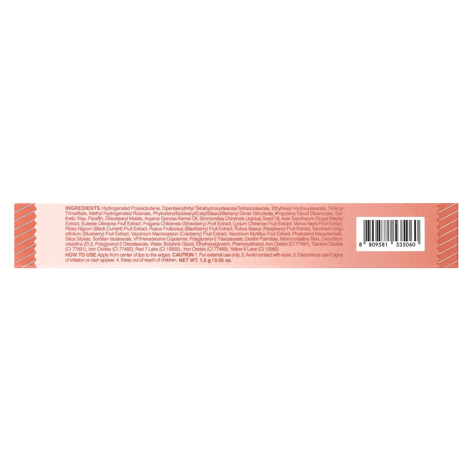 Hydrogenated polyisobutene, dipentaerythrityl tetrahydroxystearate/tetraisostearate, ethylhexyl hydroxystearate, tridecyl trimellitate, methyl hydrogenated rosinate, phytosteryl/isostearyl/cetyl/stearyl/behenyl dimer dilinoleate, propylene glycol dibenzoate, synthetic wax, paraffin, diisostearyl malate, argania spinosa kernel oil, simmondsia chinensis (jojoba) seed oil, acer saccharum (sugar maple) extract, euterpe oleracea fruit extract, fragaria chiloensis (strawberry) fruit extract, lycium chinense fruit extract, morus nigra fruit extract ribes nigrum (black currant) fruit extract, rubus fruticosus (blackberry) fruit extract, rubus idaeus (raspberry) fruit extract, vaccinium angustifolium (blueberry) fruit extract, vaccinium macrocarpon (cranberry) fruit extract, vaccinium myrtillus fruit extract, phytosteryl macadamiate, silica silylate, sorbitan isostearate, vp/hexadecene copolymer, polyglyceryl-2 triisostearate, dextrin palmitate, microcrystalline wax, cera micro cristallina (eu), polyglyceryl-2 diisostearate, water, butylene glycol, ethylhexylglycerin, phenoxyethanol, iron oxides (ci 77491), titanium dioxide (ci 77891), iron oxides (ci 77492), red 7 lake (ci 15850) , iron oxides (ci 77499), yellow 6 lake (ci 15985).