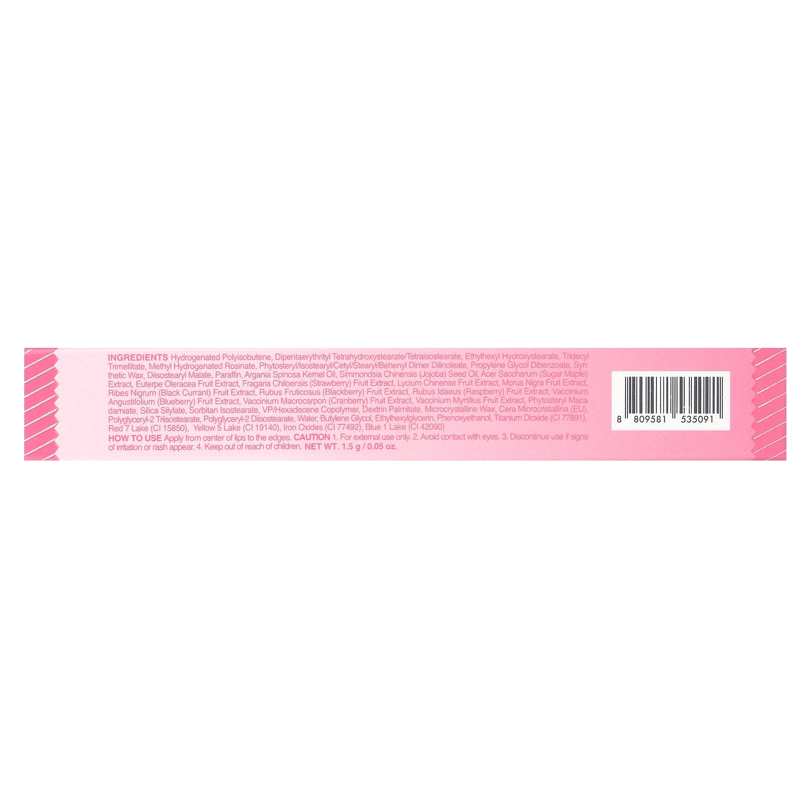 Hydrogenated polyisobutene, dipentaerythrityl tetrahydroxystearate/tetraisostearate, ethylhexyl hydroxystearate, tridecyl trimellitate, methyl hydrogenated rosinate, phytosteryl/isostearyl/cetyl/stearyl/behenyl dimer dilinoleate, propylene glycol dibenzoate, synthetic wax, diisostearyl malate, paraffin, argania spinosa kernel oil, simmondsia chinensis (jojoba) seed oil, acer saccharum (sugar maple) extract, euterpe oleracea fruit extract, fragaria chiloensis (strawberry) fruit extract, lycium chinense fruit extract, morus nigra fruit extract, ribes nigrum (black currant) fruit extract, rubus fruticosus (blackberry) fruit extract, rubus idaeus (raspberry) fruit extract, vaccinium angustifolium (blueberry) fruit extract, vaccinium macrocarpon (cranberry) fruit extract, vaccinium myrtillus fruit extract, phytosteryl maca damiate, silica silylate, sorbitan isostearate, vp/hexadecene copolymer, dextrin palmitate, microcrystalline wax, cera microcristallina (eu), polyglyceryl-2 triisostearate, polyglyceryl-2 diisostearate, water, butylene glycol, ethylhexylglycerin, phenoxyethanol, titanium dioxide (ci 77891), red 7 lake (ci 15850), yellow 5 lake (ci 19140), iron oxides (ci 77492), blue 1 lake (ci 42090).