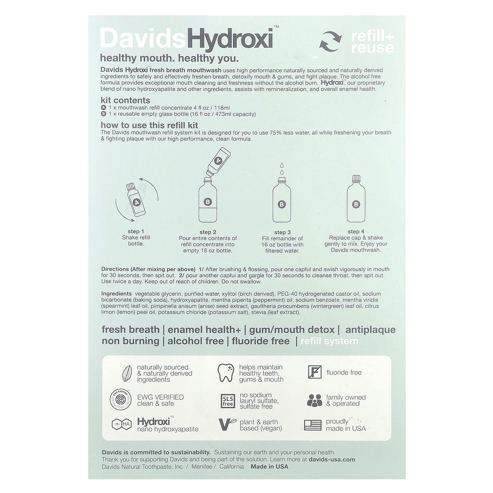 Davids Hydroxi™ fresh breath mouthwash uses high performance naturally sourced and naturally derived ingredients to safely and effectively freshen breath, detoxify mouth & gums, and fight plaque. The alcohol free formula provides exceptional mouth cleaning and freshness without the alcohol burn. Hydroxi™, our proprietary blend of nano hydroxyapatite and other ingredients, assists with remineralization, and overall enamel health.