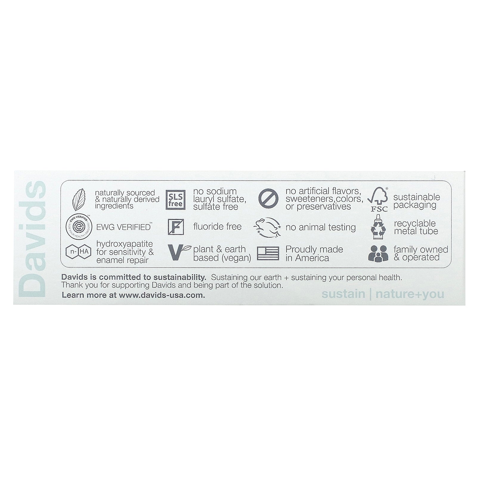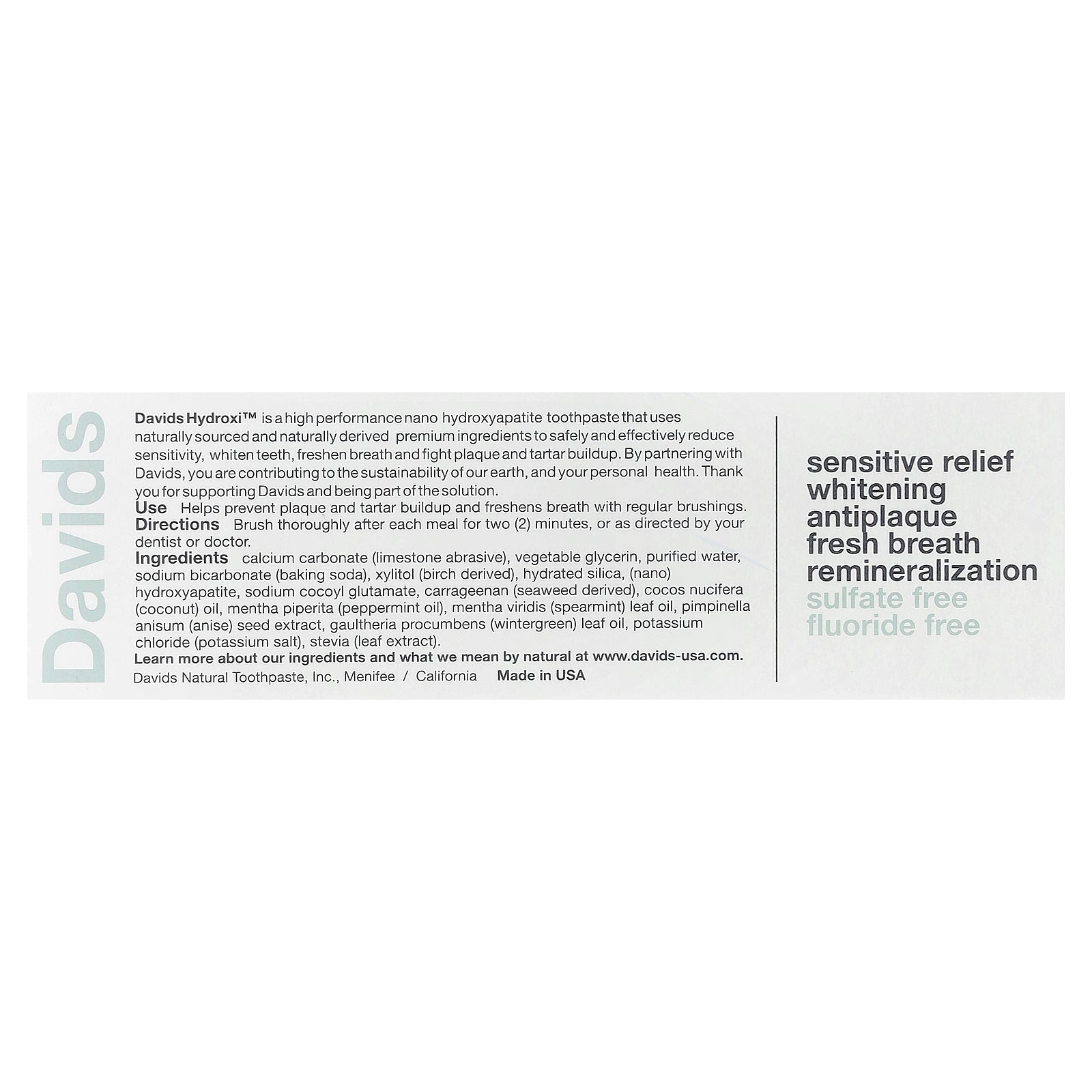 Davids Hydroxi™ is a high performance nano hydroxyapatite toothpaste that uses naturally sourced and naturally derived premium ingredients to safely and effectively reduce sensitivity, whiten teeth, freshen breath and fight plaque and tartar buildup. By partnering with Davids, you are contributing to the sustainability of our earth, and your personal health. Thank you for supporting Davids and being part of the solution.
