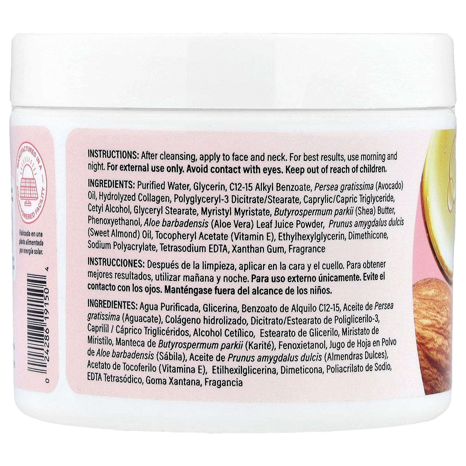 Purified water, glycerin, c12-15 alkyl benzoate, persea gratissima (avocado) oil, hydrolyzed collagen, polyglyceryl-3 dicitrate/stearate, caprylic/capric triglyceride, cetyl alcohol, glyceryl stearate, myristyl myristate, butyrospermum parkii (shea) butter, phenoxyethanol, aloe barbadensis (aloe vera) leaf juice powder, prunus amygdalus dulcis (sweet almond) oil, tocopheryl acetate (vitamin e), ethylhexylglycerin, dimethicone, sodium polyacrylate, tetrasodium edta, xanthan gum, fragrance.