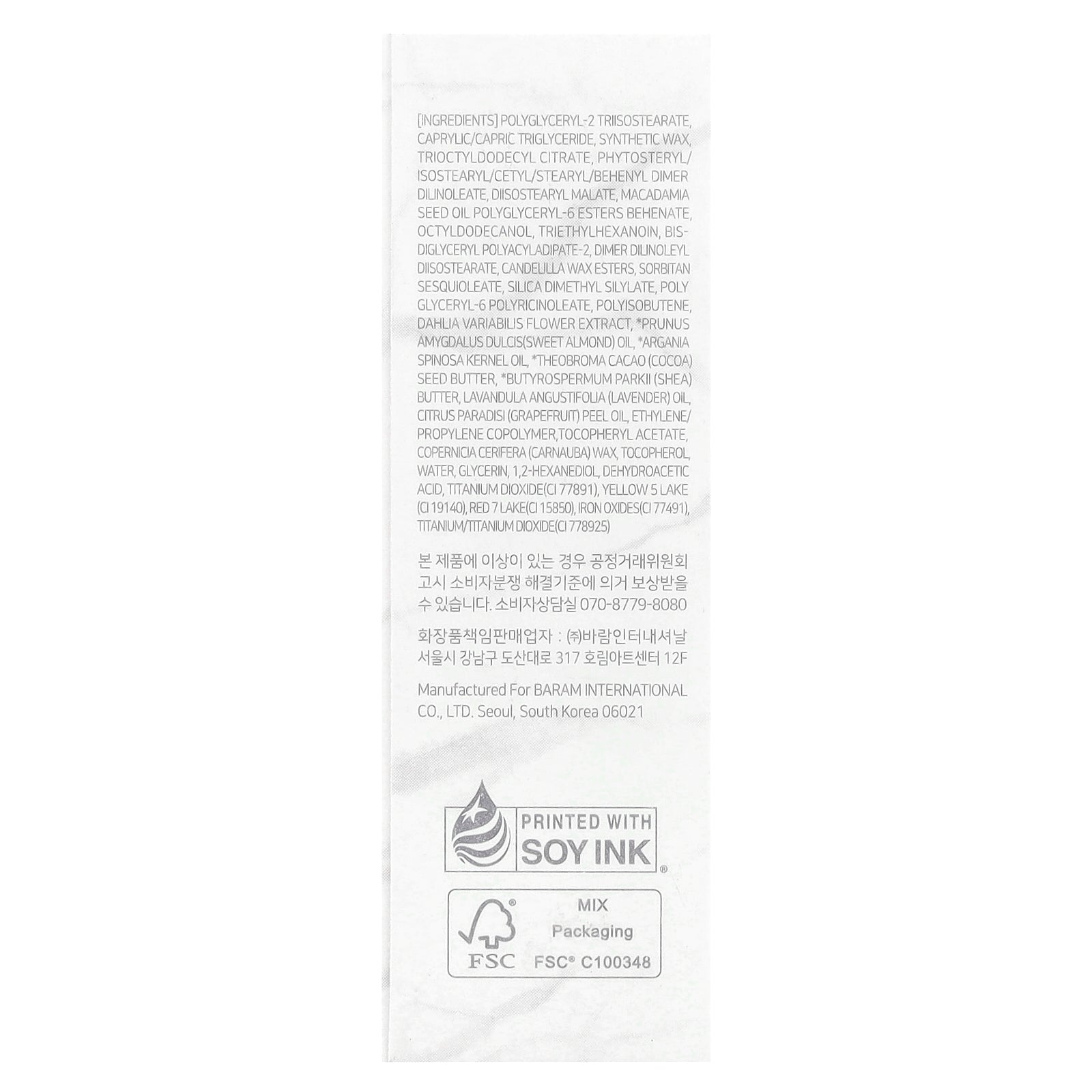 Polyglyceryl-2 triisostearate, caprylic/capric triglyceride, synthetic wax trioctyldodecyl citrate, phytosteryl/ isostearyl/cetyl/stearyl/behenyl dimer dilinoleate, diisostearyl malate, macadamia seed oil polyglyceryl-6 esters behenate, octyldodecanol, triethylhexanoin, bis- diglyceryl polyacyladipate-2, dimer dilinoleyl diisostearate, candelilla wax esters, sorbitan sesquioleate, silica dimethyl silylate, poly glyceryl-6 polyricinoleate, polyisobutene, dahlia variabilis flower extract, * prunus amygdalus dulcis(sweet almond) oil, * argania spinosa kernel oil, * theobroma cacao (cocoa) seed butter, * butyrospermum parkii (shea) butter, lavandula angustifolia (lavender) oil, citrus paradisi (grapefruit) peel oil, ethylene propylene copolymer, tocopheryl acetate, copernicia cerifera (carnauba) wax, tocopherol, water, glycerin, 1,2-hexanediol, dehydroacetic acid, titanium dioxide(ci 77891), yellow 5 lake (ci 19140), red 7 lake(ci 15850), iron oxides(ci 77491), titanium/titanium dioxide(ci 778925).