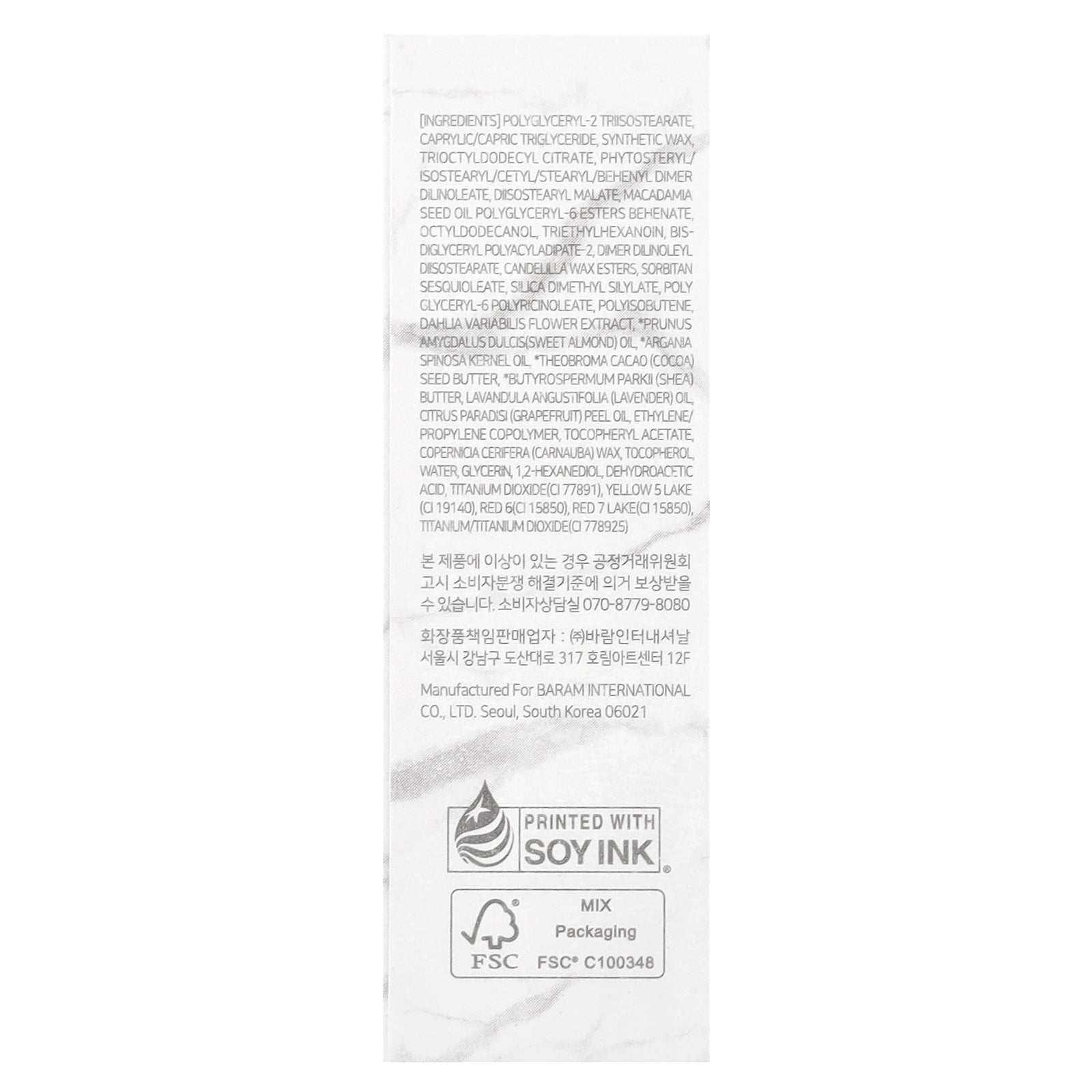 Polyglyceryl-2 triisostearate, caprylic/capric triglyceride, synthetic wax, trioctyldodecyl citrate, phytosteryl/ isostearyl/cetyl/stearyl/behenyl dimer dilinoleate, diisostearyl malate macadamia seed oil polyglyceryl-6 esters behenate octyldodecanol, triethylhexanoin, bis- diglyceryl polyacyladipate-2, dimer dilinoleyl diisostearate, candelilla wax esters, sorbitan sesquioleate, silica dimethyl silylate, poly glyceryl-6 polyricinoleate, polyisobutene, dahlia variabilis flower extract, *prunus amygdalus dulcis(sweet almond) oil, *argania spinosa kernel oil *theobroma cacao (cocoa) seed butter, *butyrospermum parkii (shea) butter, lavandula angustifolia (lavender) oil, citrus paradisi (grapefruit) peel oil, ethylene/ propylene copolymer, tocopheryl acetate, copernicia cerifera (carnauba) wax, tocopherol, water, glycerin, 1,2-hexanediol, dehydroacetic acid, titanium dioxide(ci 77891), yellow 5 lake (ci 19140), red 6(c) 15850), red 7 lake(ci 15850) titanium/titanium dioxide(ci 778925).