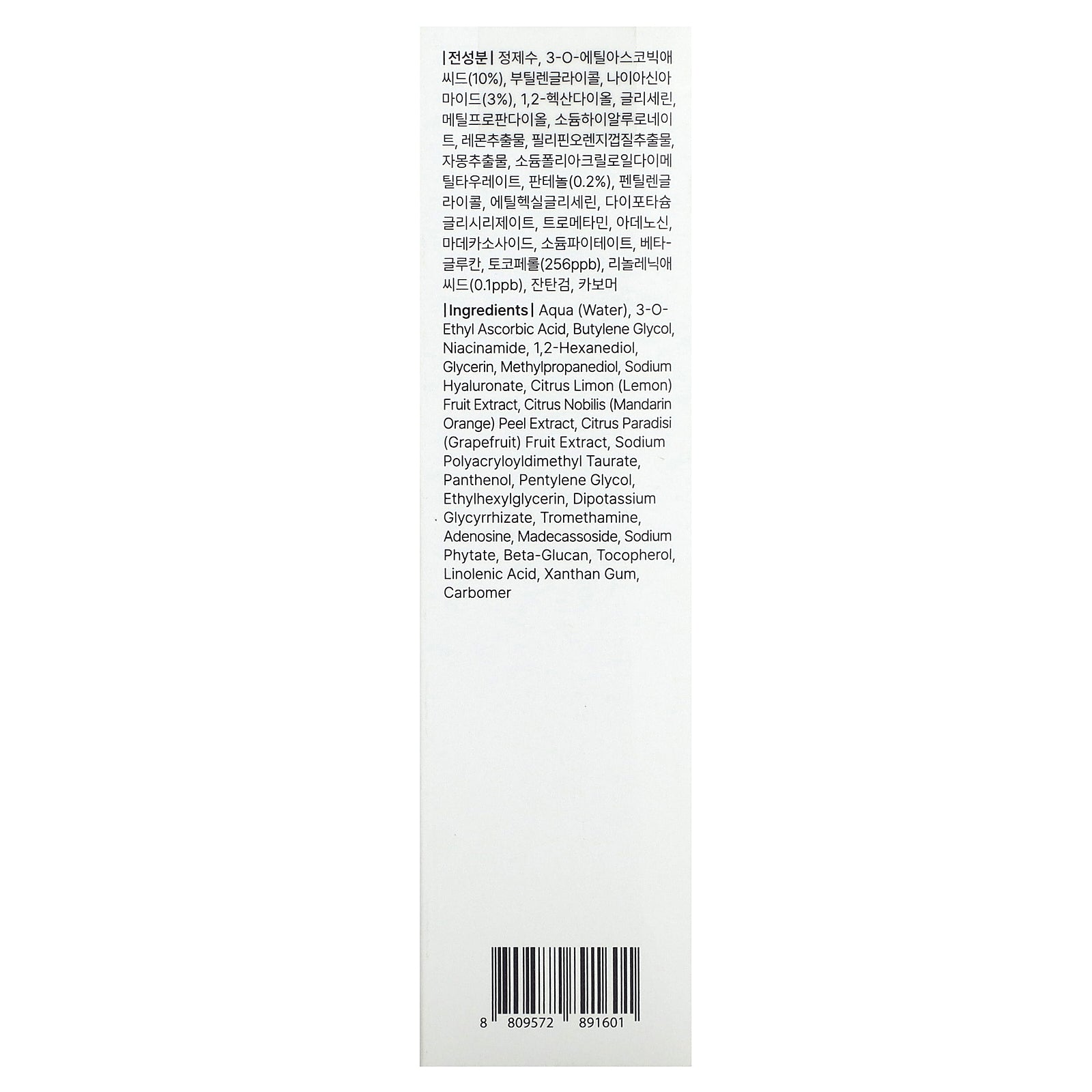 Water, 3-0- ethyl ascorbic acid, butylene glycol, niacinamide, 1,2-hexanediol, glycerin, methylpropanediol, sodium hyaluronate, citrus limon (lemon) fruit extract, citrus nobilis (mandarin orange) peel extract, citrus paradisi (grapefruit) fruit extract, sodium polyacryloyldimethyl taurate, panthenol, pentylene glycol, ethylhexylglycerin, dipotassium glycyrrhizate, tromethamine, adenosine, madecassoside, sodium phytate, beta-glucan, tocopherol, linolenic acid, xanthan gum, carbomer.
