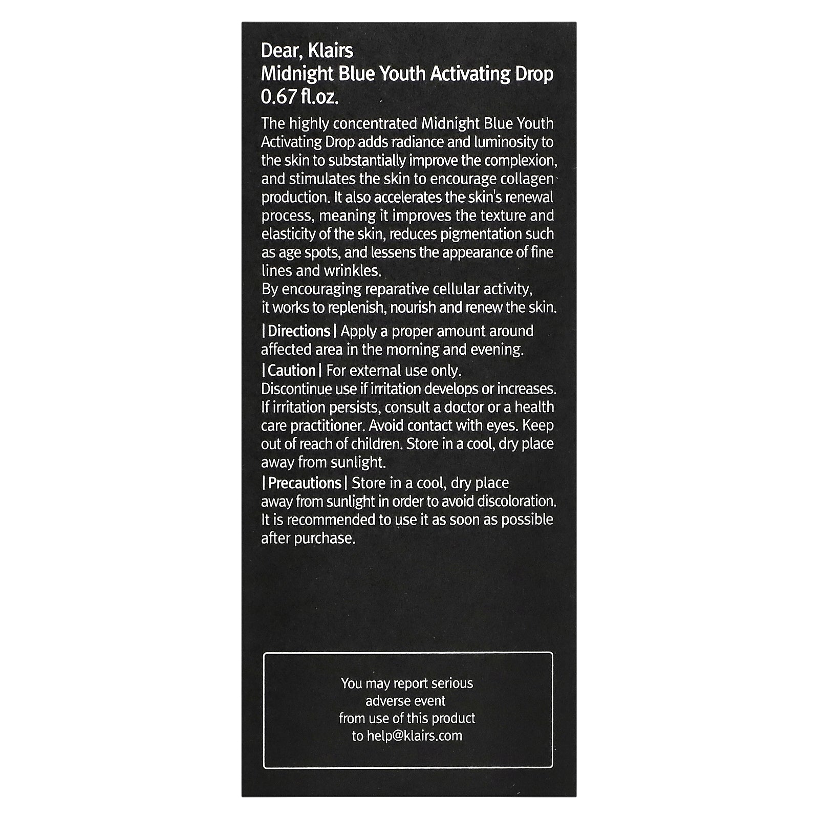 The highly concentrated Midnight Blue Youth Activating Drops adds radiance and luminosity to the skin to substantially improve the complexion, and stimulates the skin to encourage collagen production. It also accelerates the skin's renewal process, meaning it improves the texture and elasticity of the skin, reduces pigmentation such as age spots, and lessens the appearance of fine lines and wrinkles.