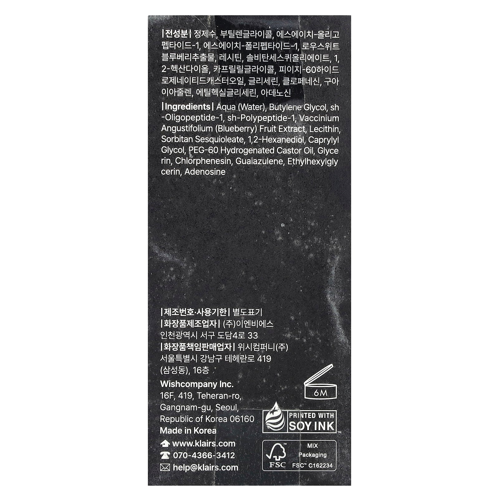 Water, butylene glycol, sh-oligopeptide-1, sh-polypeptide-1, vaccinium angustifolium (blueberry) fruit extract, lecithin, sorbitan sesquioleate, 1,2-hexanediol, caprylyl glycol, peg-60 hydrogenated castor oil, glycerin, chlorphenesin, guaiazulene, ethylhexylglycerin, adenosine.