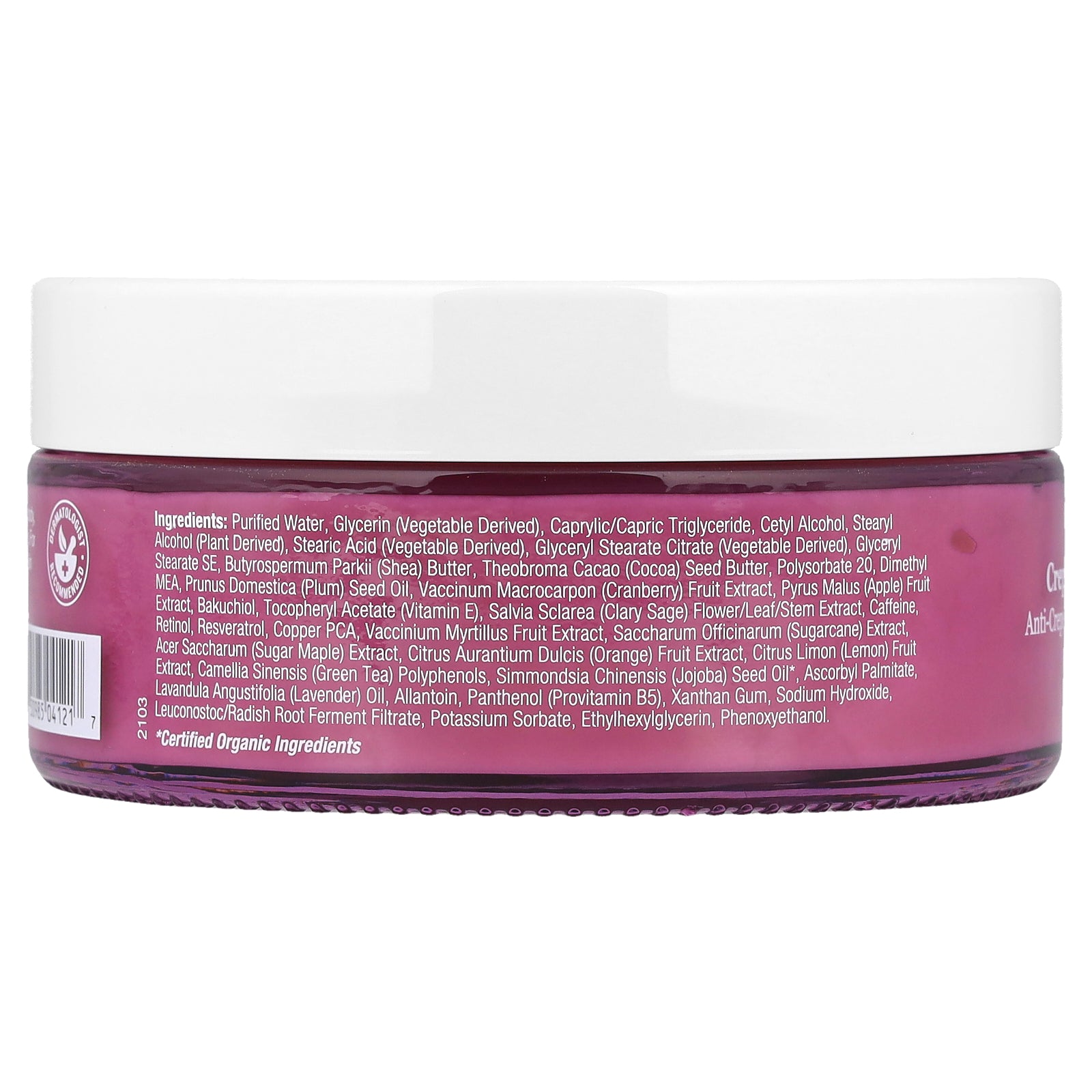 Purified water, glycerin (vegetable derived), caprylic/capric triglyceride, cetyl alcohol, stearyl alcohol (plant derived), stearic acid (vegetable derived), glyceryl stearate citrate (vegetable derived), glyceryl stearate se, butyrospermum parkii (shea) butter, theobroma cacao (cocoa) seed butter, polysorbate 20, dimethyl mea, prunus domestica (plum) seed oil, vaccinum macrocarpon (cranberry) fruit extract, pyrus malus (apple) fruit extract, bakuchiol, tocopheryl acetate (vitamin e), salvia sclarea (clary sage) flower/leaf/stem extract, caffeine, retinol, resveratrol, copper pca, vaccinium myrtillus fruit extract, saccharum officinarum (sugarcane) extract, acer saccharum (sugar maple) extract, citrus aurantium dulcis (orange) fruit extract, citrus limon (lemon) fruit extract, camellia sinensis (green tea) polyphenols, simmondsia chinensis (jojoba) seed oil*, ascorbyl palmitate, lavandula angustifolia (lavender) oil, allantoin, panthenol (provitamin b5), xanthan gum, sodium hydroxide, leuconostoc/radish root ferment filtrate, potassium sorbate, ethylhexylglycerin, phenoxyethanol.