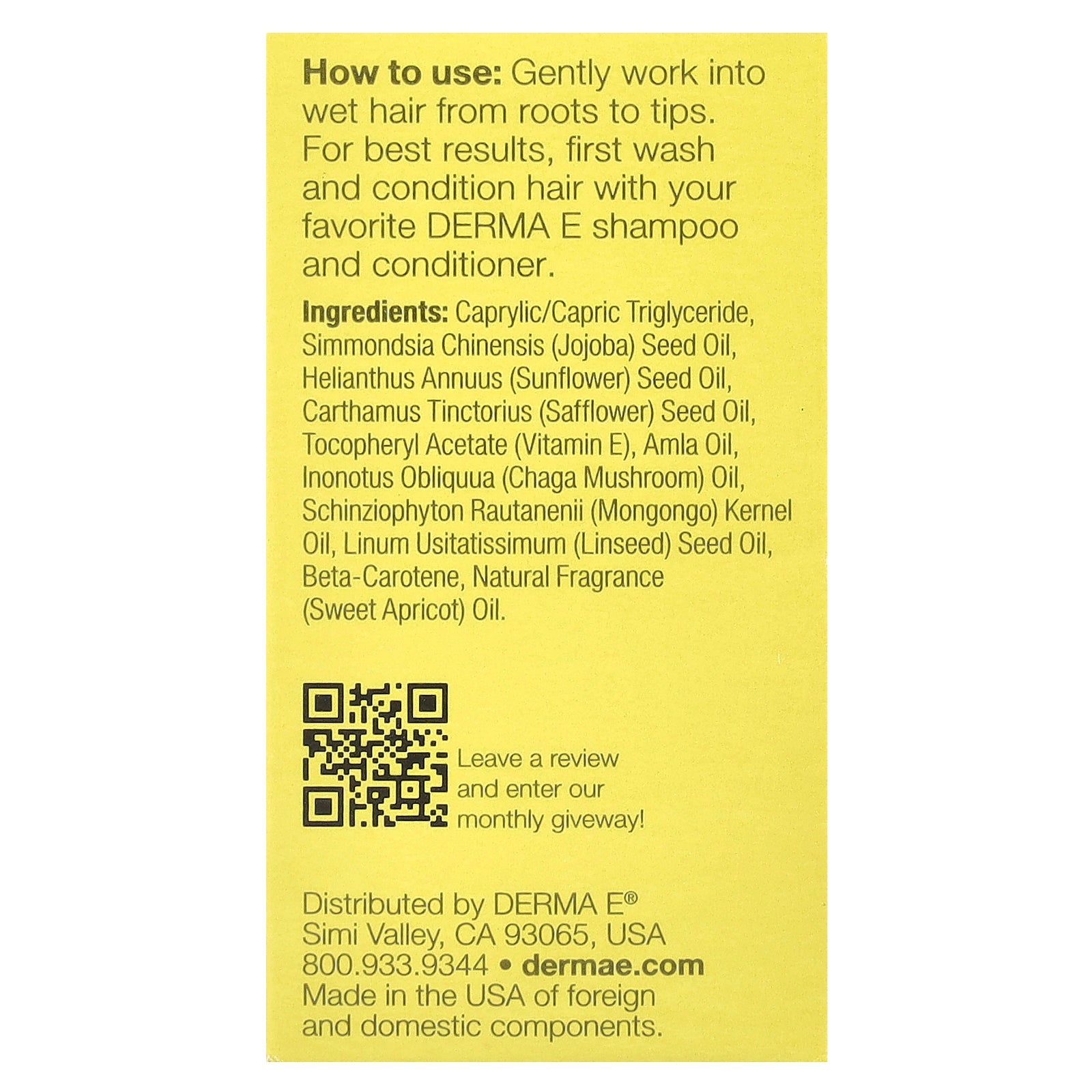 Gently work into wet hair from roots to tips. For best results, first wash and condition hair with your favorite DERMA E shampoo and conditioner.