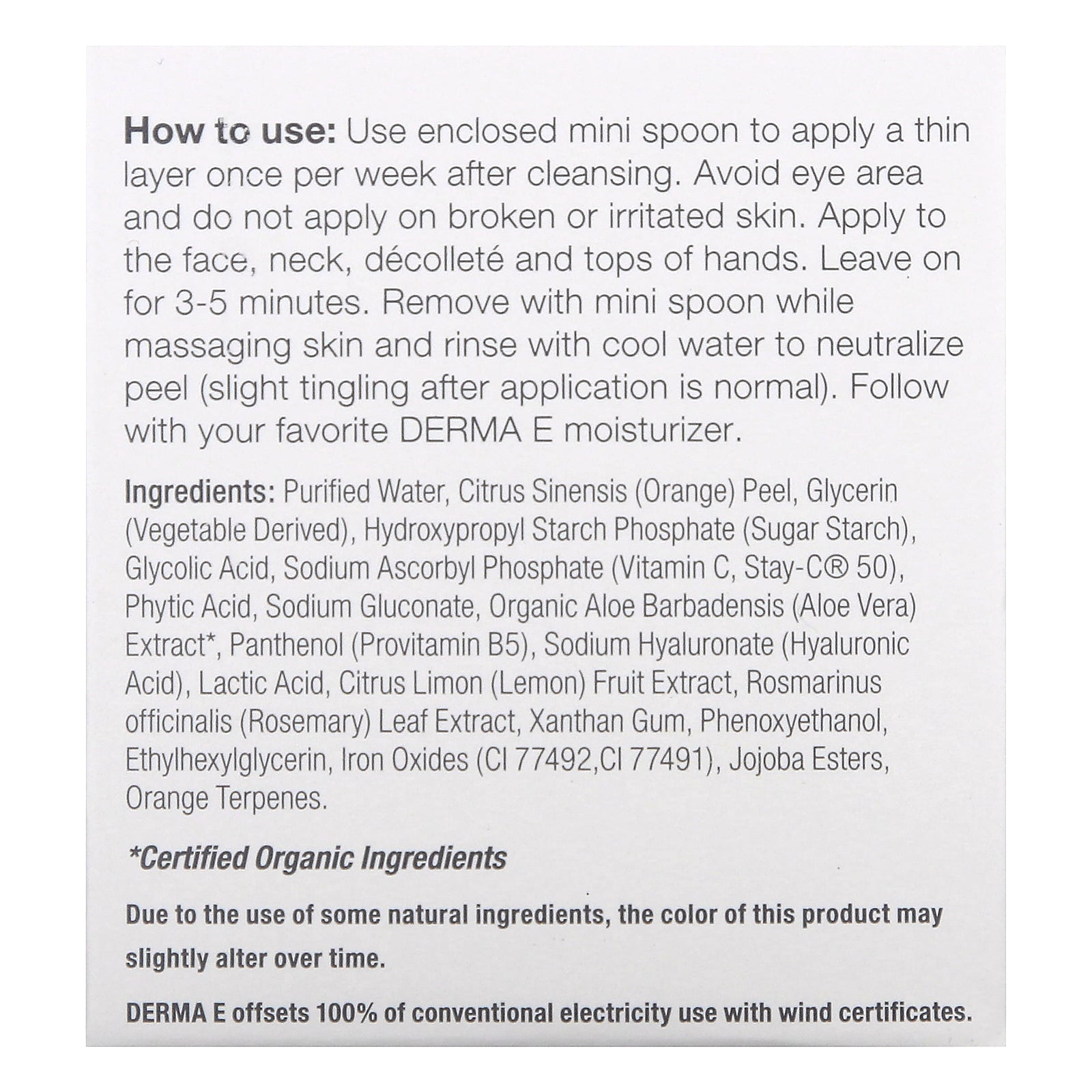 Use enclosed mini spoon to apply a thin layer once per week after cleansing. Avoid eye area and do not apply on broken or irritated skin. Apply to the face, neck, decollete and tops of hands. Leave on for 3-5 minutes. Remove with mini spoon while massaging skin and rinse with cool water to neutralize peel (slight tingling after application is normal). Follow with your favorite DERMA E moisturizer.