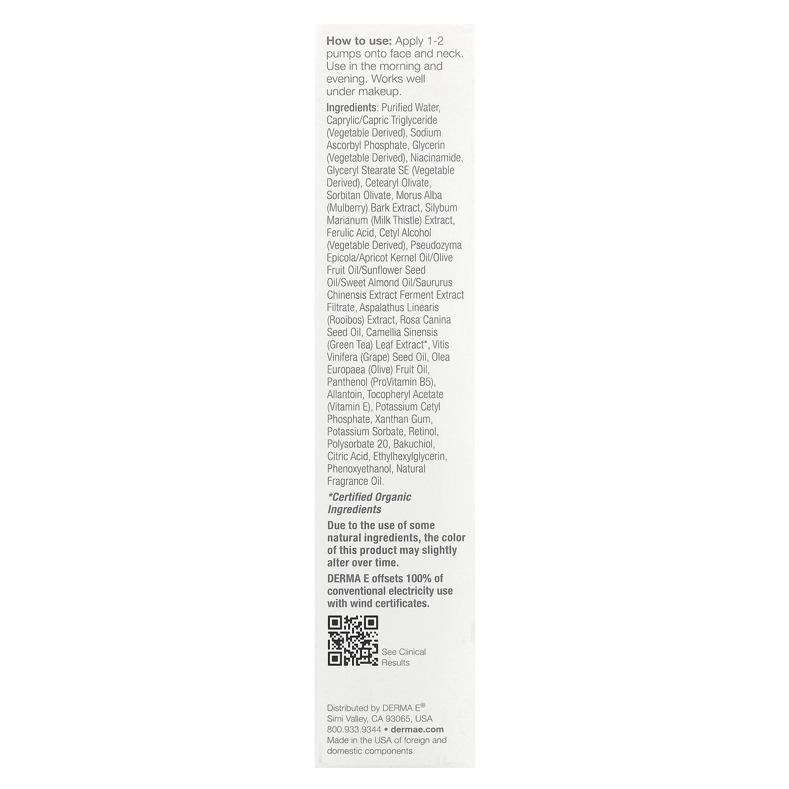 Purified water, caprylic/capric triglyceride (vegetable derived), sodium ascorbyl phosphate, glycerin (vegetable derived), niacinamide, glyceryl stearate se (vegetable derived), cetearyl olivate, sorbitan olivate, morus alba (mulberry) bark extract, silybum marianum (milk thistle) extract, ferulic acid, cetyl alcohol (vegetable derived), pseudozyma epicola/apricot kernel oil/olive fruit oil/sunflower seed oil/sweet almond oil/saururus chinensis extract ferment extract filtrate, aspalathus linearis (rooibos) extract, rosa canina seed oil, camellia sinensis (green tea) leaf extract*, vitis vinifera (grape) seed oil, olea europaea (olive) fruit oil, panthenol (provitamin b5), allantoin, tocopheryl acetate (vitamin e), potassium cetyl phosphate, xanthan gum, potassium sorbate, retinol, polysorbate 20, bakuchiol, citric acid, ethylhexylglycerin, phenoxyethanol, natural fragrance oil.