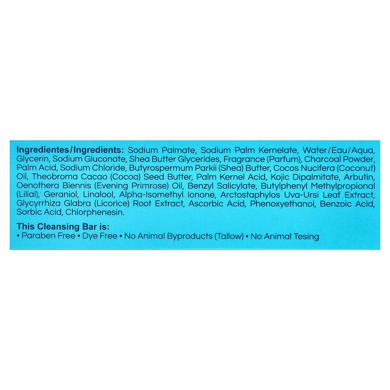 Sodium palmate, sodium palm kernelate, water, glycerin, sodium gluconate, shea butter glycerides, fragrance (parfum), charcoal powder, palm acid, sodium chloride, butyrospermum parkii (shea) butter, cocos nucifera (coconut) oil, theobroma cacao (cocoa) seed butter, palm kernel acid, kojic dipalmitate, arbutin, oenothera biennis (evening primrose) oil, benzyl salicylate, butylphenyl methylpropional (lilial), geraniol, linalool, alpha-isomethyl lonone, arctostaphylos uva-ursi leaf extract, glycyrrhiza glabra (licorice) root extract, ascorbic acid, phenoxyethanol, benzoic acid, sorbic acid, chlorphenesin.