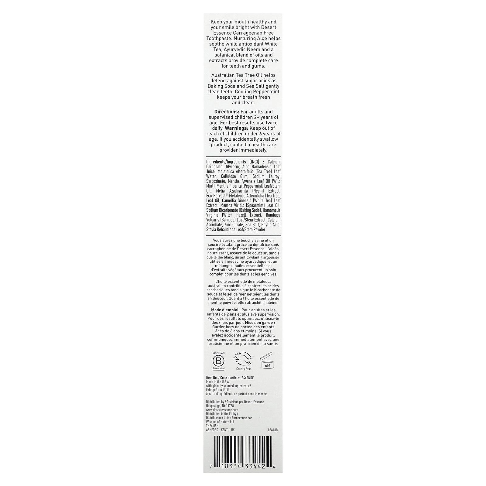 Keep your mouth healthy and your smile bright with Desert Essence Carrageenan Free Toothpaste. Nurturing Aloe helps soothe while antioxidant White Tea, Ayurvedic Neem and a botanical blend of oils and extracts provide complete care for teeth and gums.