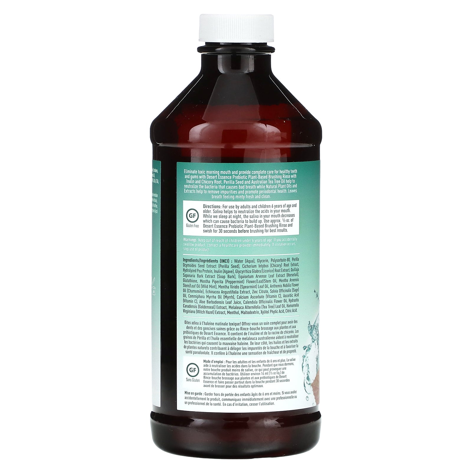 Eliminate toxic morning mouth and provide complete for healthy teeth and gums with Desert Essence Prebiotic Plant-Based Brushing Rinse with Inulin and Chicory Root. Perilla Seed and Australian Tea Tree Oil help to neutralize the bacteria that causes bad breath while Natural Plant Oils and Extracts help to remove impurities and promote periodontal health. Leaves breath feeling minty fresh and clean.