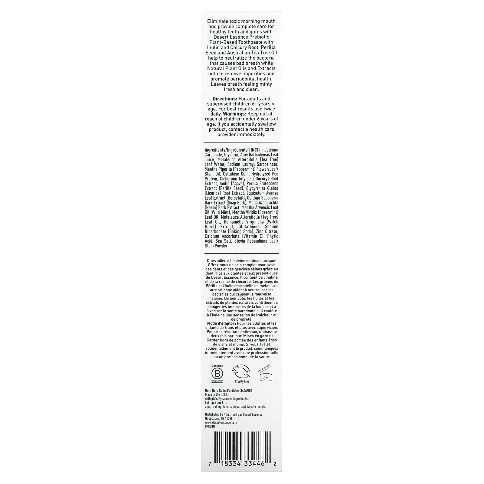 Eliminate toxic morning mouth and provide complete care for healthy teeth and gums with Desert Essence Prebiotic Plant-Based Toothpaste with Inulin and Chicory Root. Perilla Seed and Australian Tea Tree Oil help to neutralize the bacteria that causes bad breath while Natural Plant Oils and Extracts help to remove impurities and promote periodontal health. Leaves breath feeling minty fresh and clean.