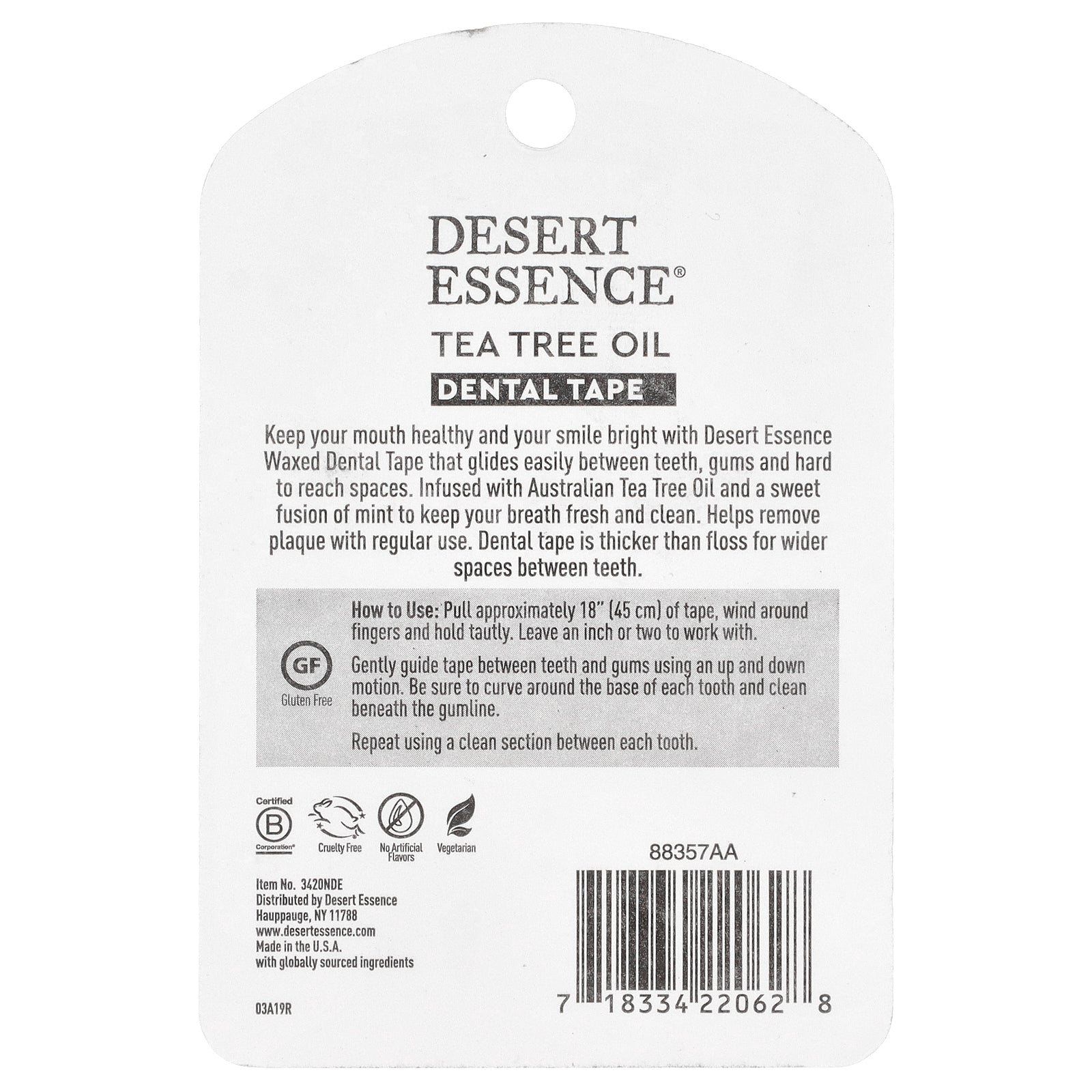 Keep your mouth healthy and your smile bright with Desert Essence Waxed Dental Tape that glides easily between teeth, gums and hard to reach spaces. Infused with Australian Tea Tree Oil and a sweet fusion of mint to keep your breath fresh and clean. Helps remove plaque with regular use. Dental tape is thicker than floss for wider spaces between teeth.
