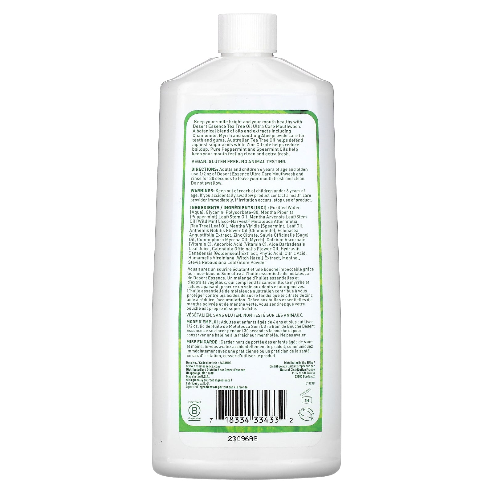 Keep your smile bright and your mouth healthy with Desert Essence Tea Tree Oil Ultra Care Mouthwash. A botanical blend of oils and extracts including Chamomile, Myrrh and soothing Aloe provide complete care for teeth and gums. Australian Tea Tree Oil helps defend against sugar acids while Zinc Citrate helps reduce buildup. Pure Peppermint and Spearmint Oils help keep your mouth feeling clean and extra fresh.