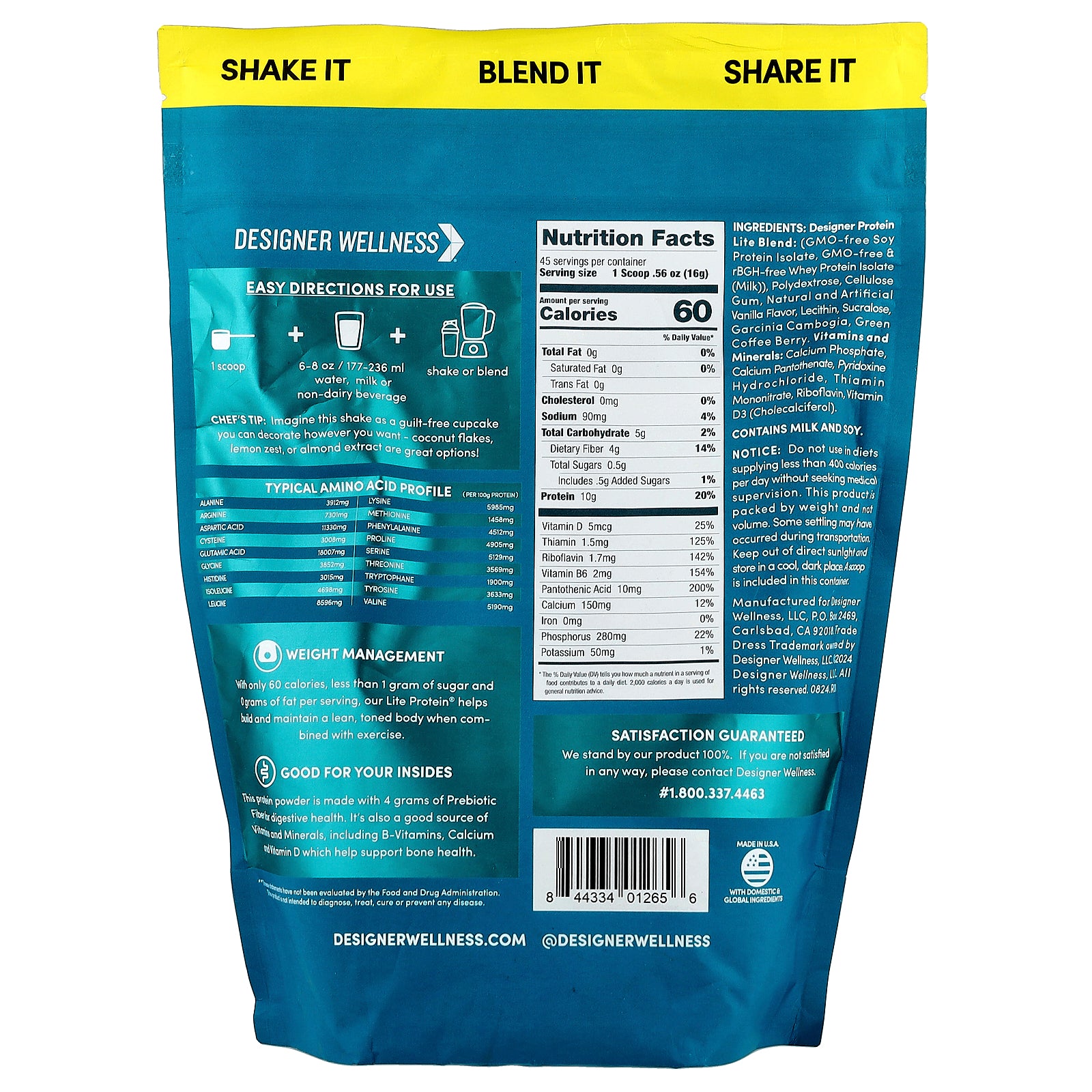 Designer protein lite blend: (gmo-free soy protein isolate, gmo-free & rbgh-free whey protein isolate (milk)), polydextrose, cellulose gum, natural and artificial vanilla flavor, lecithin, sucralose, garcinia cambogia, green coffee berry. vitamins and minerals: calcium phosphate, calcium pantothenate, pyridoxine hydrochloride, thiamin mononitrate, riboflavin, vitamin d3 (cholecalciferol).