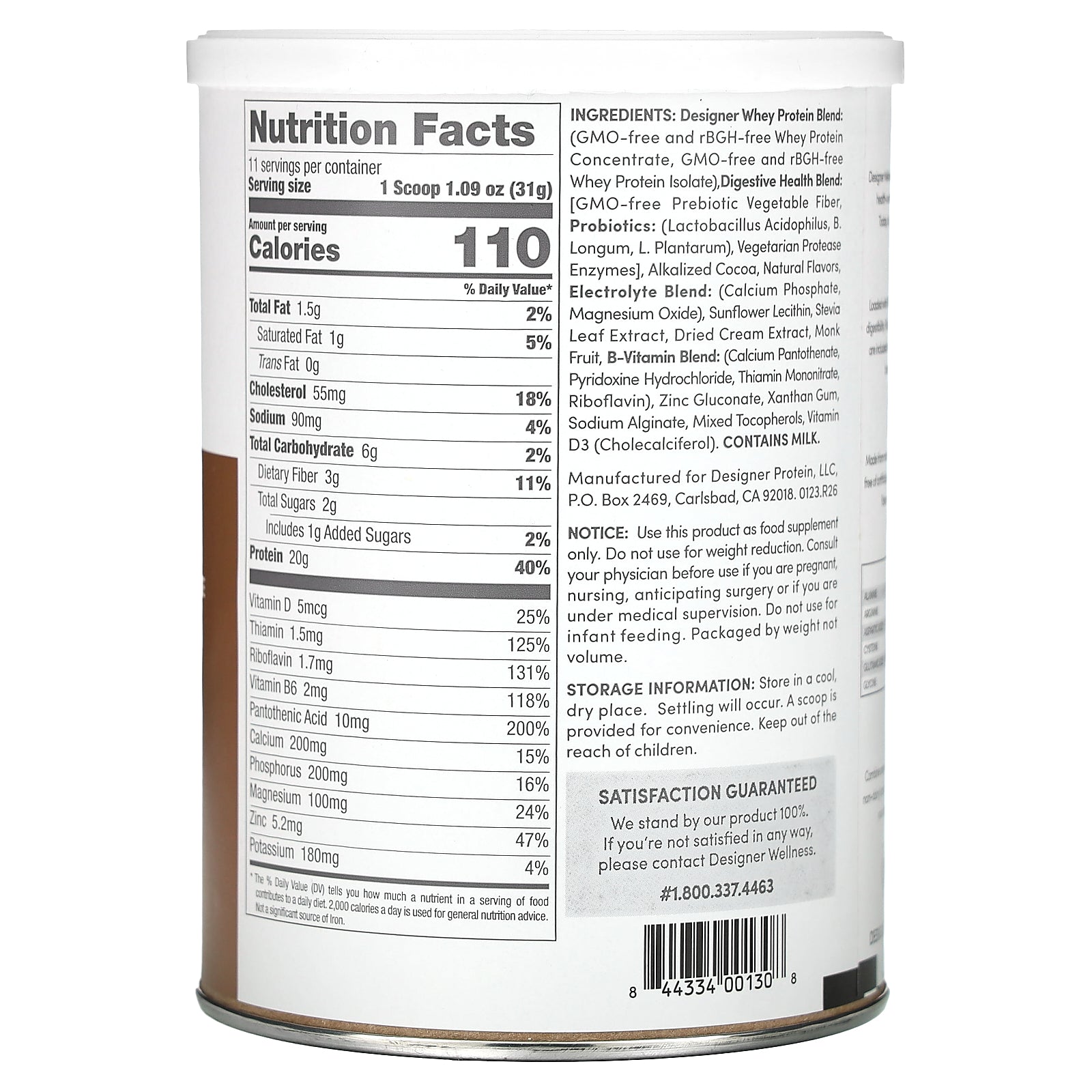 Designer whey protein blend: (gmo-free and rBGH-Free whey protein concentrate, gmo-free and rBGH-Free whey protein isolate), digestive health blend: [gmo-free prebiotic vegetable fiber, probiotics: (lactobacillus acidophilus, b. longum, l. plantarum), vegetarian protease enzymes], alkalized cocoa, natural flavors, electrolyte blend: (calcium phosphate, magnesium oxide), sunflower lecithin, stevia leaf extract, dried cream extract, monk fruit, b-vitamin blend: (calcium pantothenate, pyridoxine hydrochloride, thiamin mononitrate, riboflavin), zinc gluconate, xanthan gum, sodium alginate, mixed tocopherols, vitamin d3 (cholecalciferol).