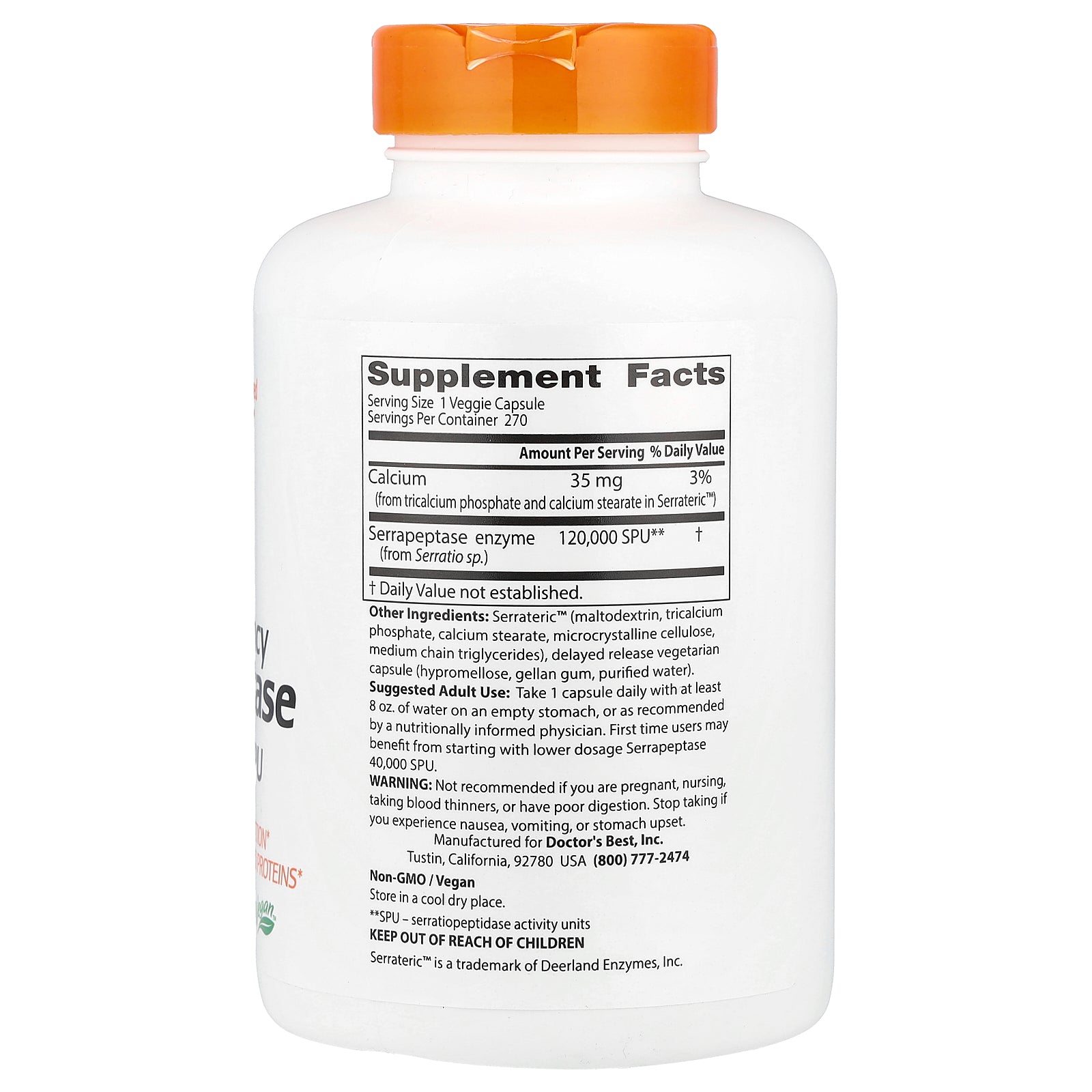 Serrapeptase (serratio-peptidase) is a protein-digesting enzyme isolated from the friendly bacterium Serratia E-15 discovered in the Japanese silkworm, and has been used as a nutritional supplement in Europe and Asia for decades. Doctor's Best Serrapeptase 120,000 SPU is formulated with Serrateric™, a superior alternative to enteric coating that protects the individual enzyme until it reaches the intestine for optimal absorption.