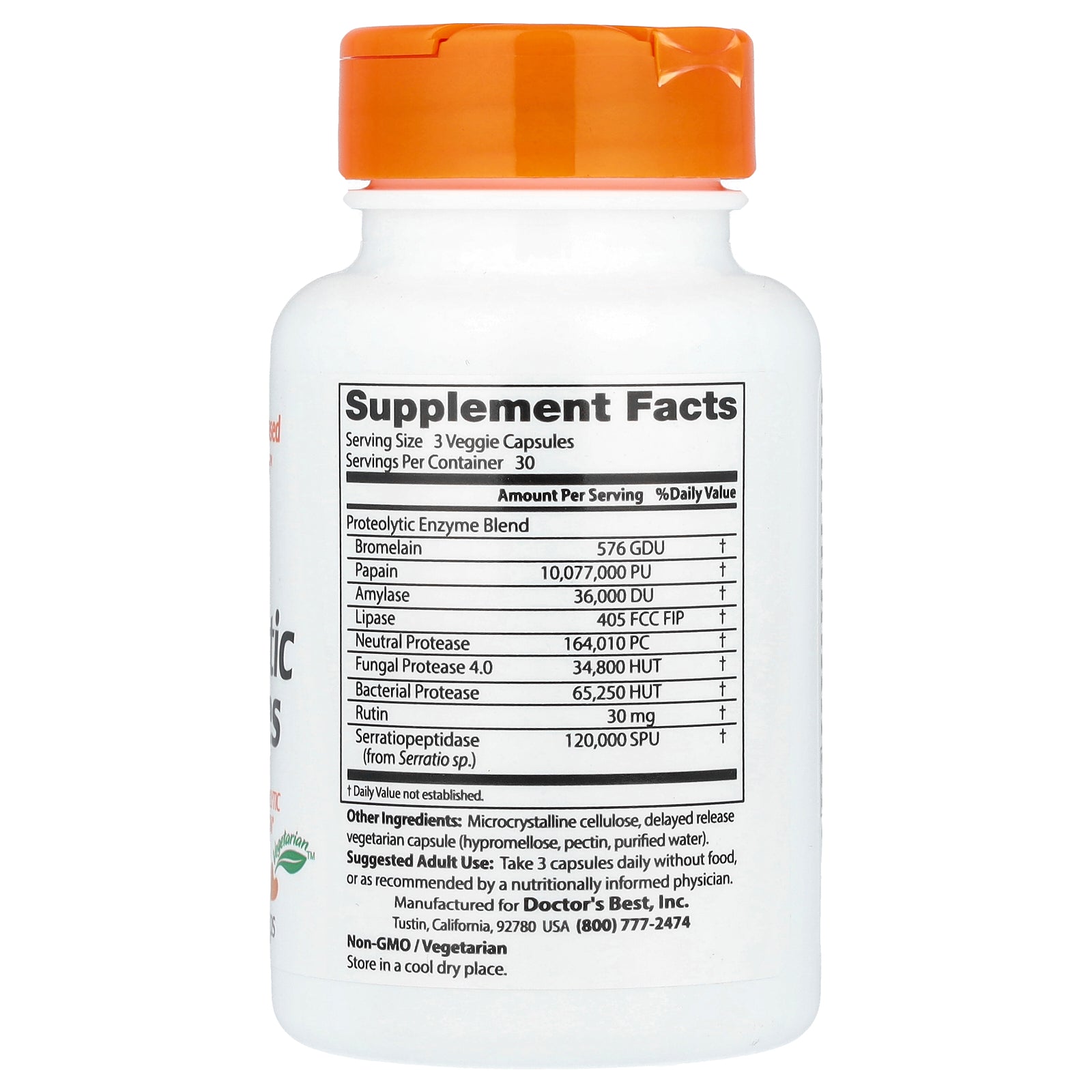 Doctor's Best Proteolytic Enzymes is a potent formulation containing a broad spectrum of vegetarian proteolytic enzymes. Proteolytic enzymes function in the body to digest and break down proteins into their amino acid components. Supplementing with proteolytic enzymes facilities chemical reactions that support normal metabolic functions throughout the body. Delayed release vegetarian capsules help active ingredients to get into intestines for proper absorption and function to support overall immune system health.