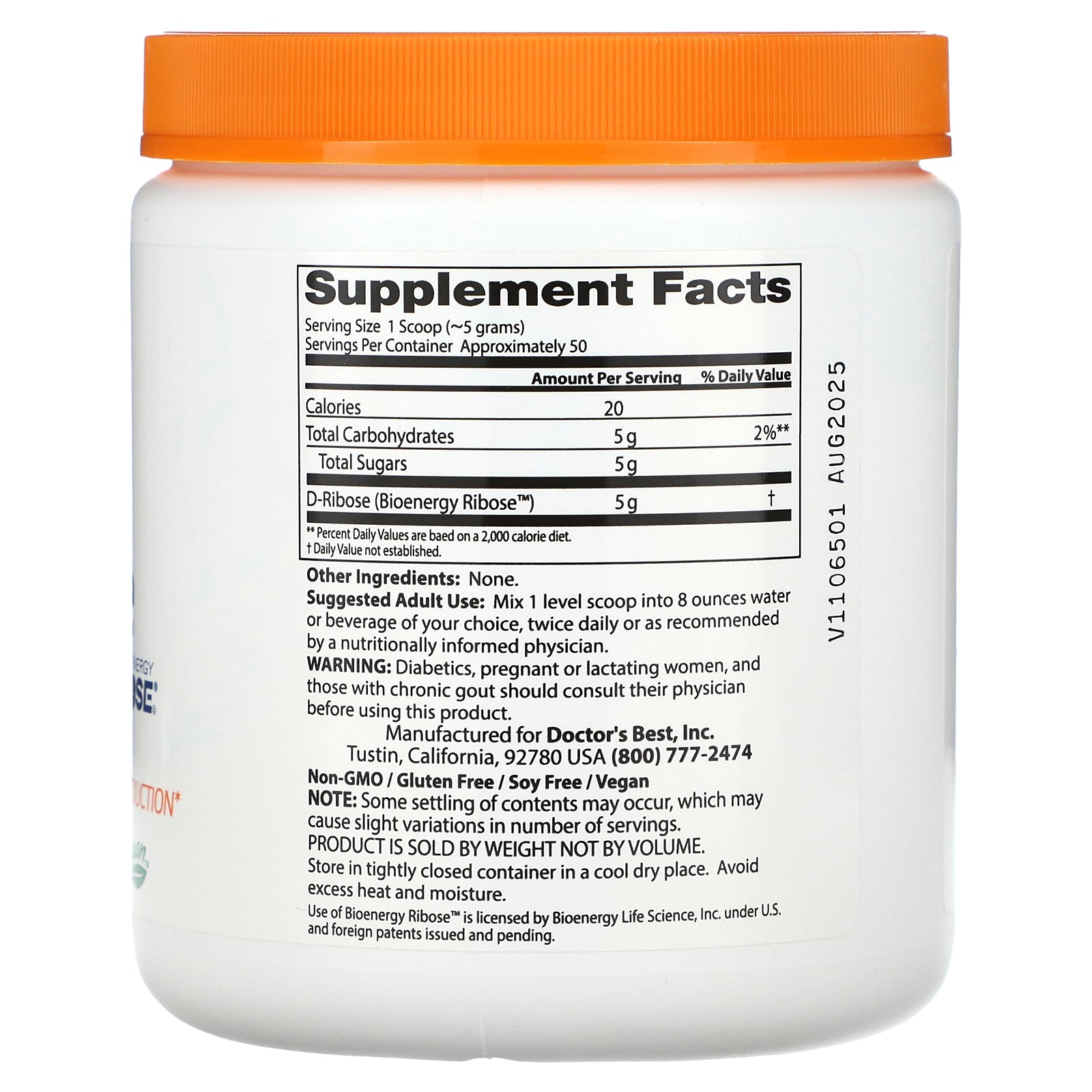 Doctor's Best D-Ribose is a unique 5-carbon carbohydrate that is a fundamental building block of ATP (adenosine triphosphate), the source for all cellular energy. Ribose is the starting point and rate limiting compound in the synthesis of these fundamental cellular compounds and the availability of ribose determines the rate at which they can be made by our cells and tissues. Studies have shown that ribose supplementation can enhance energy levels in the heart and support metabolism. Further studies suggest that ribose plays a role in supporting muscle energy recovery after exercise. Exercise increases free radical production in muscle tissue. Ribose may strengthen and support the body’s crucial antioxidant defenses.