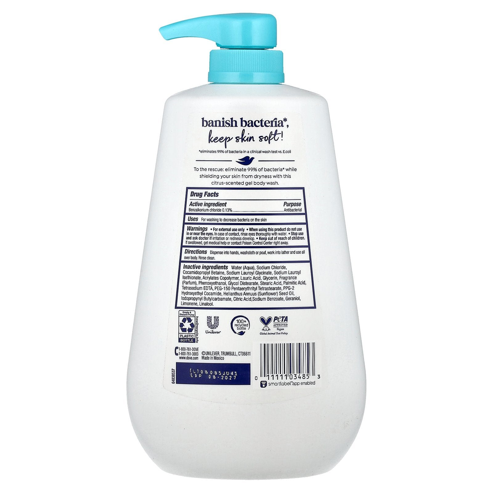 To the rescue: eliminate 99% of bacteria* while shielding your skin from dryness with this citrus-scented gel body wash.