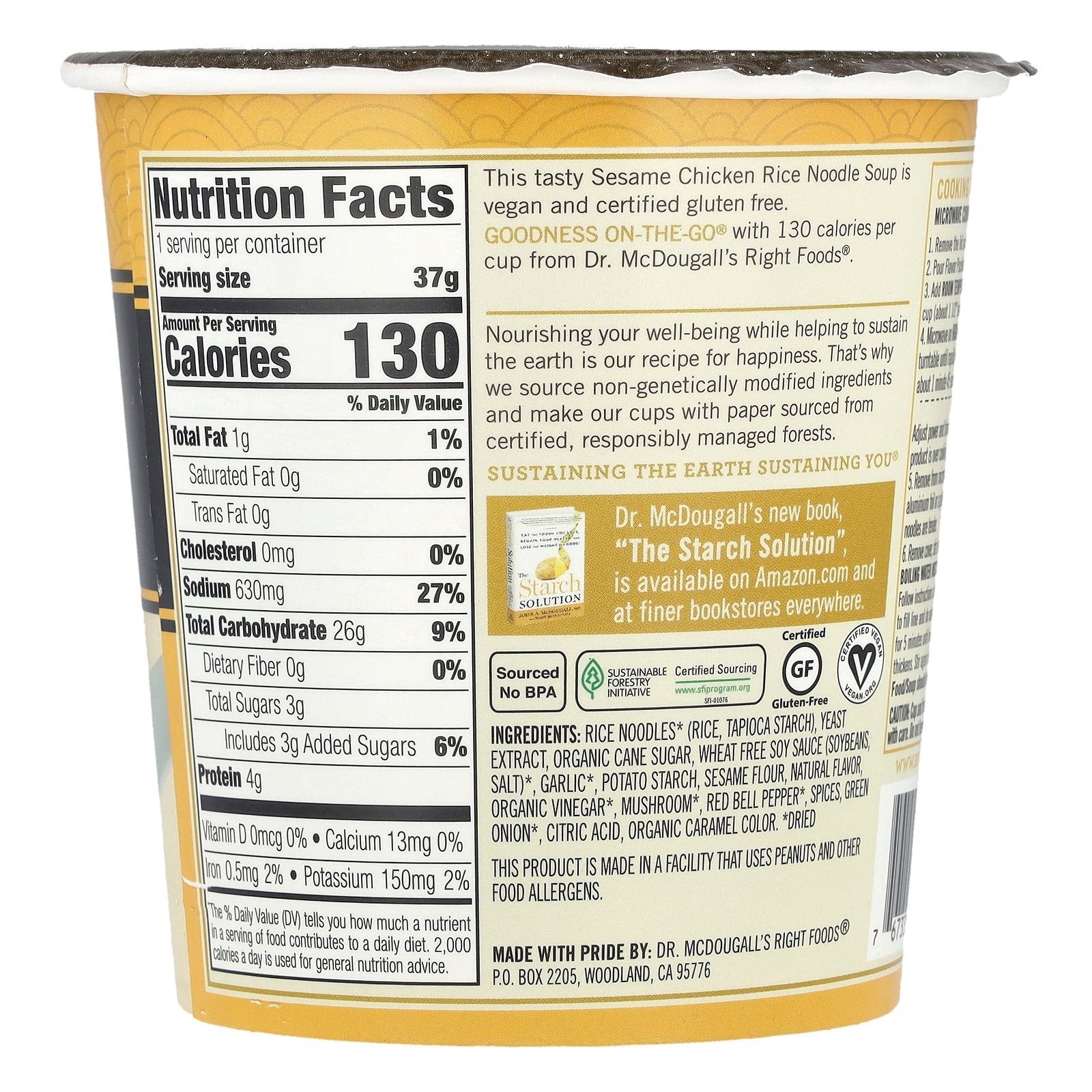 This tasty Sesame Chicken Rice Noodle Soup is vegan and certified gluten free. Goodness On-The-Go® with 130 calories per cup from Dr. McDougall's Right Foods®.
