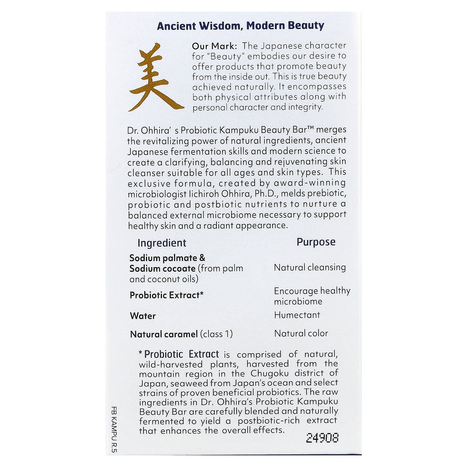 Dr. Ohhira's Probiotic Kampuku Beauty Bar™ merges the revitalizing power of natural ingredients, ancient Japanese fermentation skills and modern science to create a clarifying, balancing and rejuvenating skin cleanser suitable for all ages and skin types. This exclusive formula, created by award-winning microbiologist Iichiroh Ohhira, Ph.D., melds prebiotic, probiotic and postbiotic nutrients to nurture a balanced external microbiome necessary to support healthy skin and a radiant appearance.