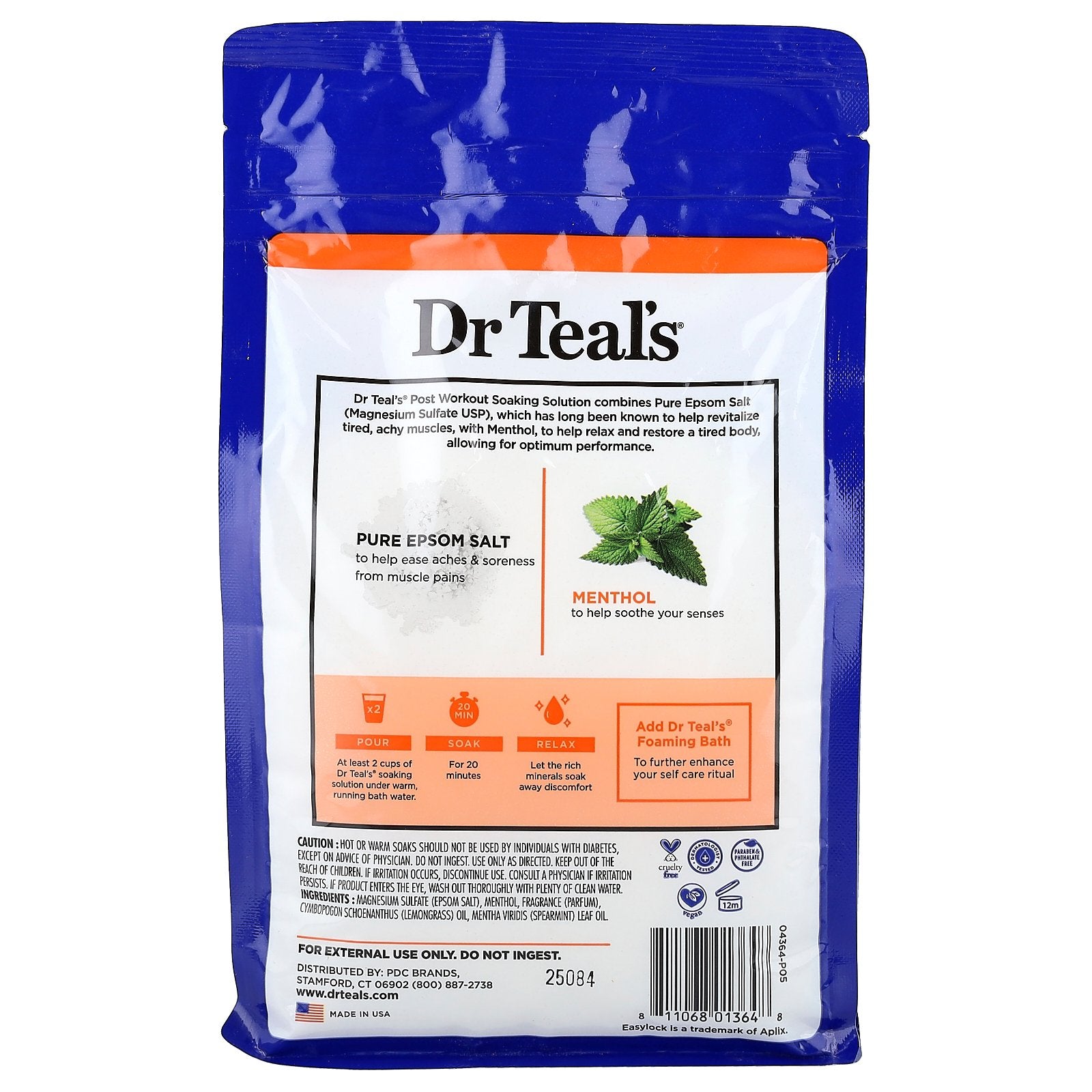 Dr Teal's® Post Workout Soaking Solution combines Pure Epsom Salt (Magnesium Sulfate USP), which has long been known to help revitalize tired, achy muscles, with Menthol, to help relax and restore a tired body, allowing for optimum performance.