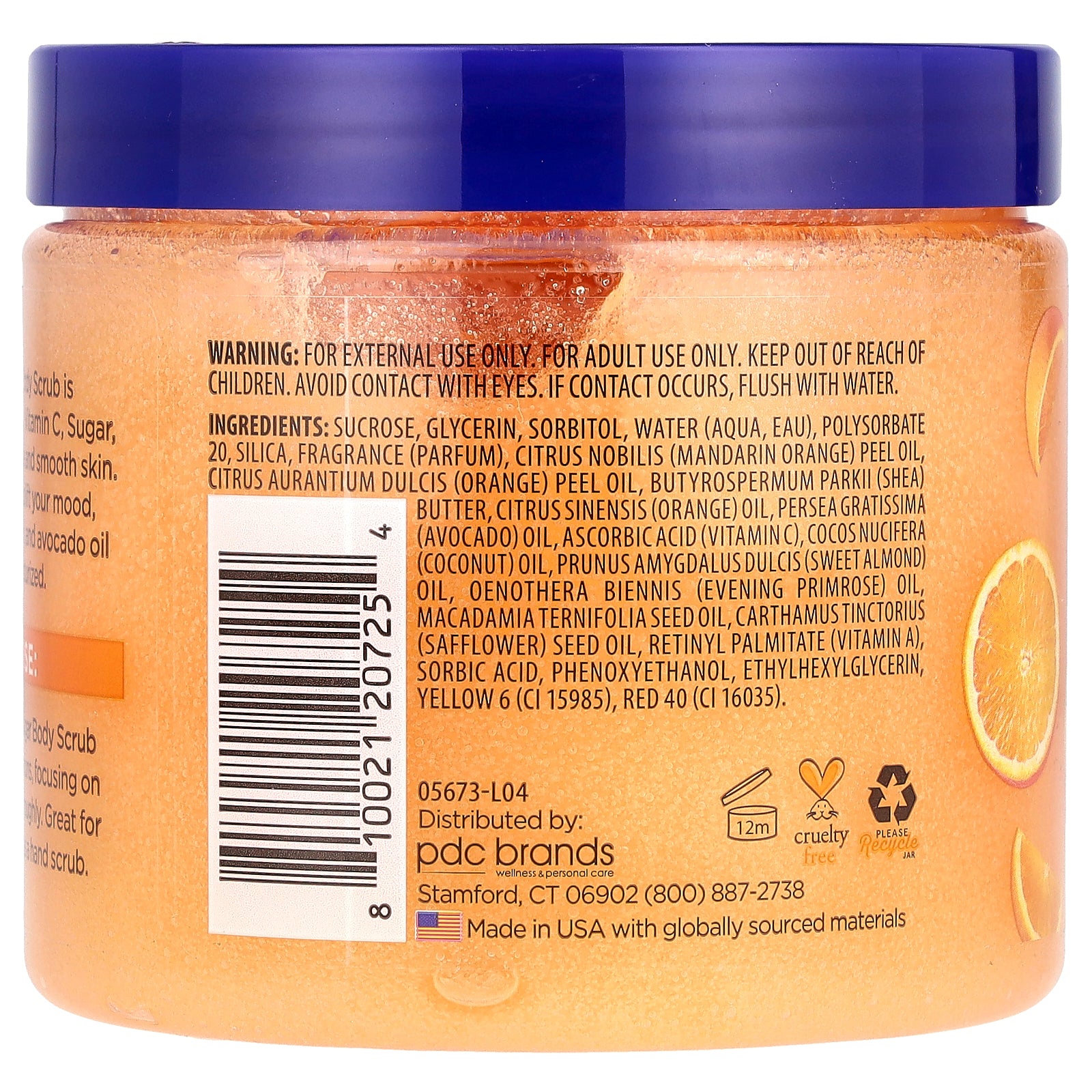 Sucrose, glycerin, sorbitol, water, polysorbate 20, silica, fragrance (parfum), citrus nobilis (mandarin orange) peel oil, citrus aurantium dulcis (orange) peel oil, butyrospermum parkii (shea) butter, citrus sinensis (orange) oil, persea gratissima (avocado) oil, ascorbic acid (vitamin c), cocos nucifera (coconut) oil, prunus amygdalus dulcis (sweet almond) oil, oenothera biennis (evening primrose) oil, macadamia ternifolia seed oil, carthamus tinctorius (safflower) seed oil, retinyl palmitate (vitamin a), sorbic acid, phenoxyethanol, ethylhexylglycerin, yellow 6 (ci 15985), red 40 (ci 16035).