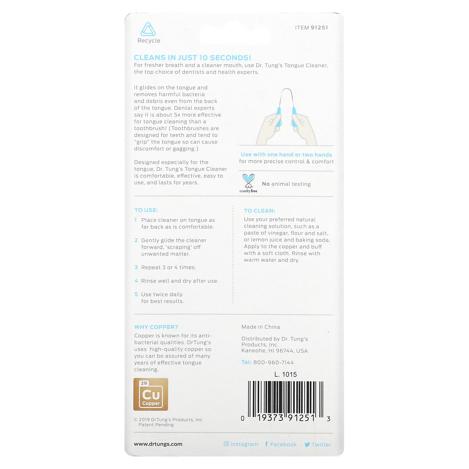 Copper is known for its antibacterial qualities. Dr. Tung's uses high-quality copper so you can be assured of many years of effective tongue cleaning.