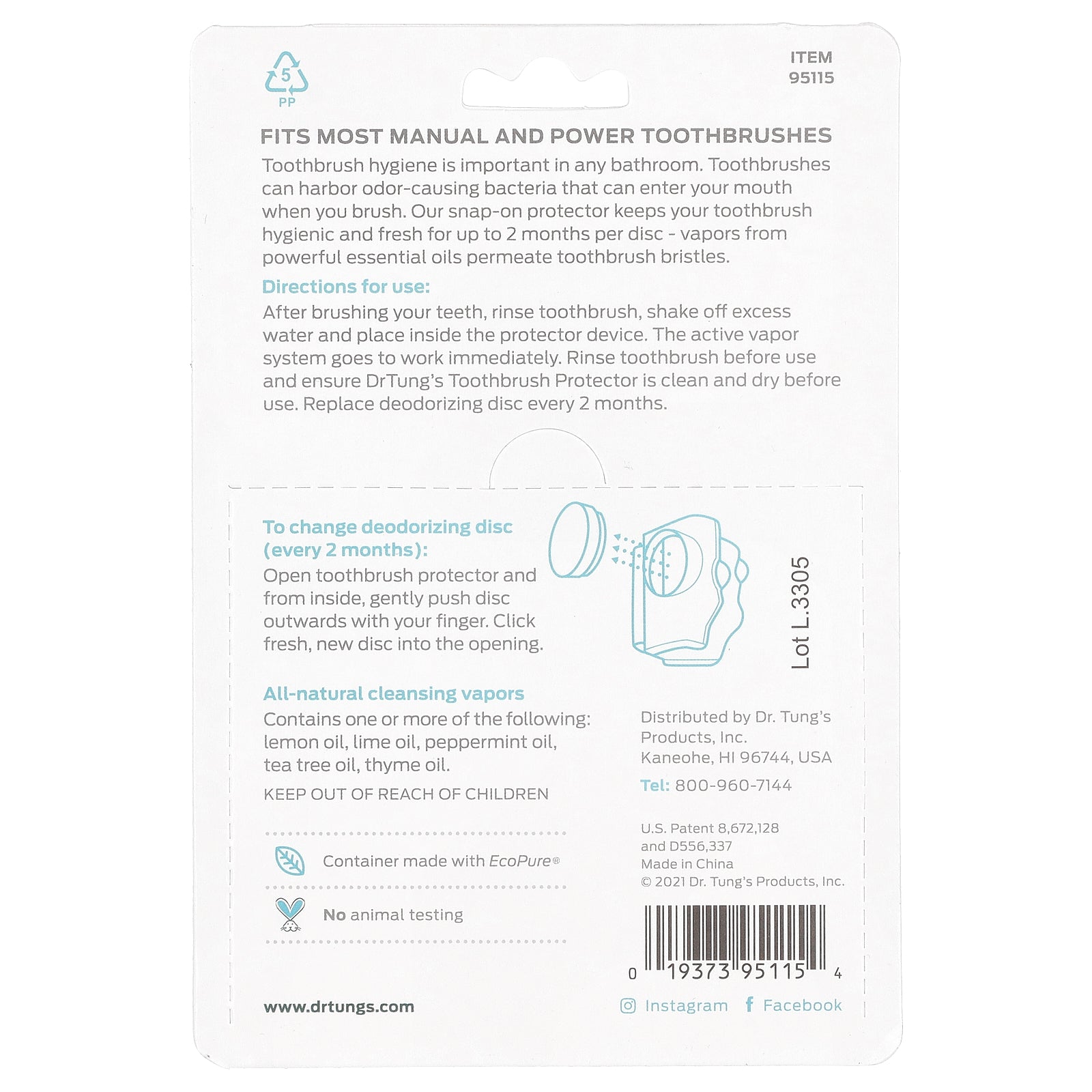 After brushing your teeth, rinse toothbrush, shake off excess water and place inside the protector device. The active vapor system goes to work immediately. Rinse toothbrush before use and ensure DrTung's Toothbrush Protector is clean and dry before use. Replace deodorizing disc every 2 months.