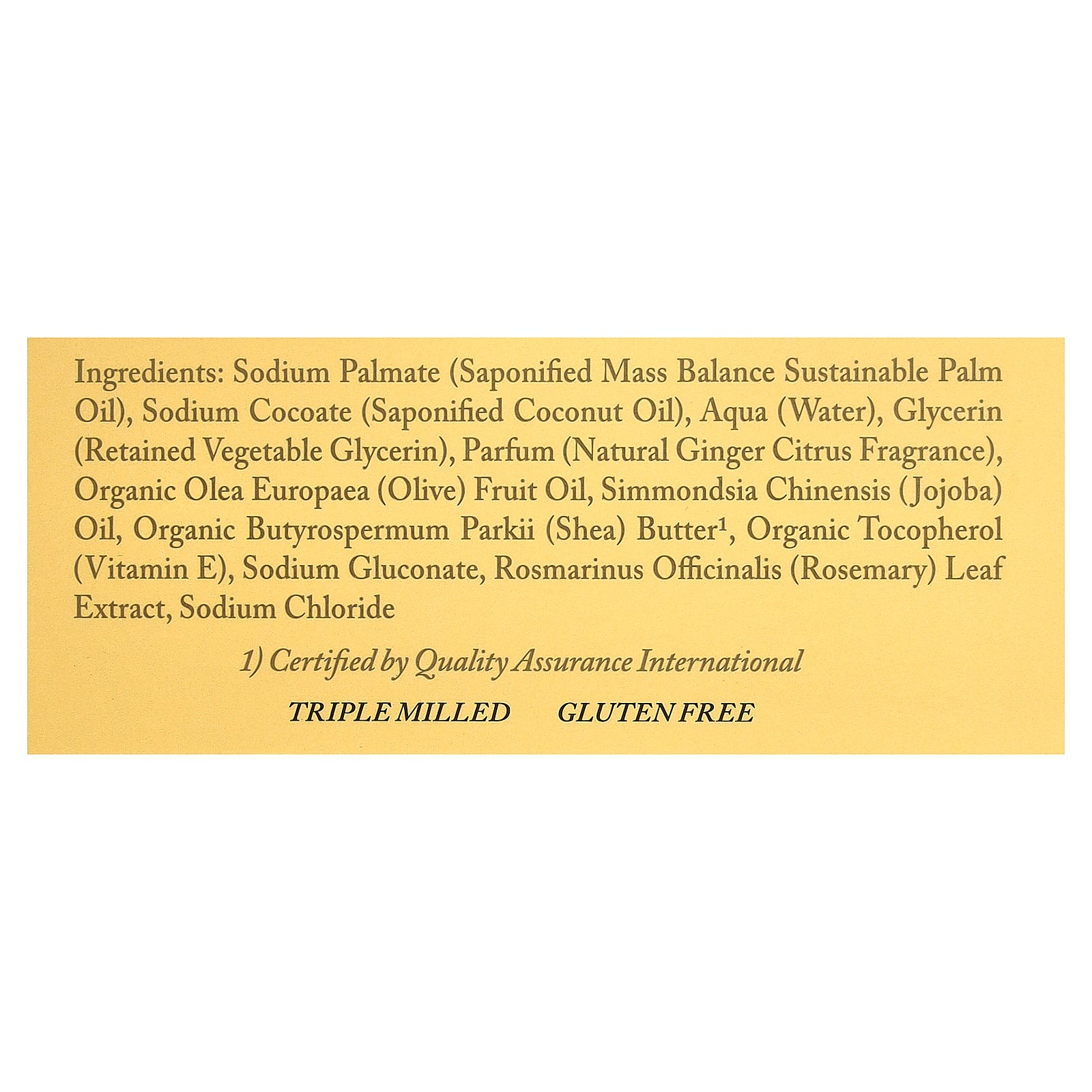 Sodium palmate (saponified mass balance sustainable palm oil), sodium cocoate (saponified coconut oil), aqua (water), glycerin (retained vegetable glycerin), parfum (natural ginger citrus fragrance), organic olea europaea (olive) fruit oil, simmondsia chinensis (jojoba) oil, organic butyrospermum parkii (shea) butter¹, organic tocopherol (vitamin E), sodium gluconate, rosmarinus officinalis (rosemary) leaf extract, sodium chloride.