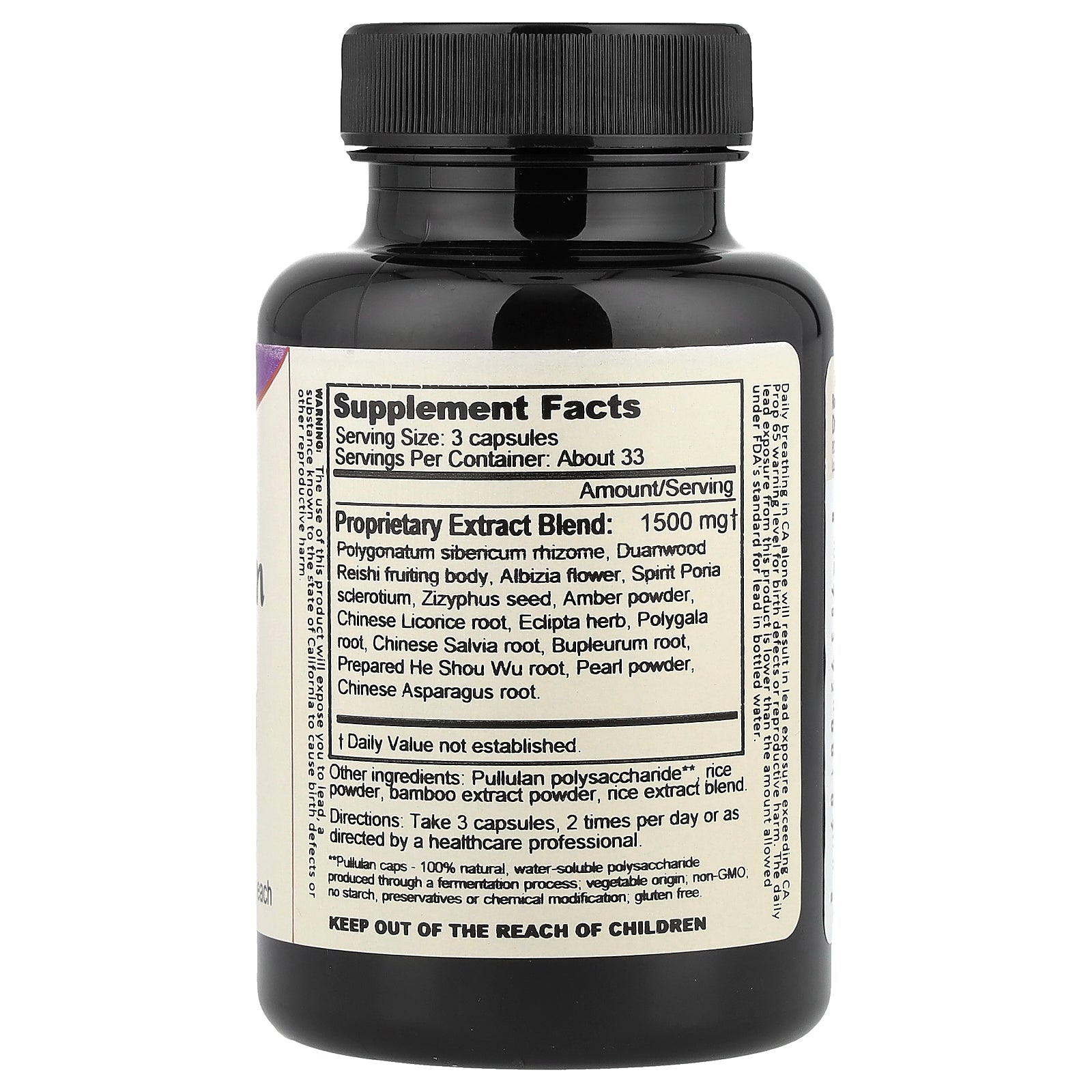 Proprietary Extract Blend: Polygonatum sibericum rhizome, Duanwood Reishi fruiting body, Albizia flower, Spirit Poria Sclerotium, Zizyphus seed, Amber powder, Chinese Licorice root, Eclipta herb, Polygala root, Chinese Salvia root, Bupleurum root, Prepared He Shou Wu root, Pearl powder, Chinese Asparagus root. |
