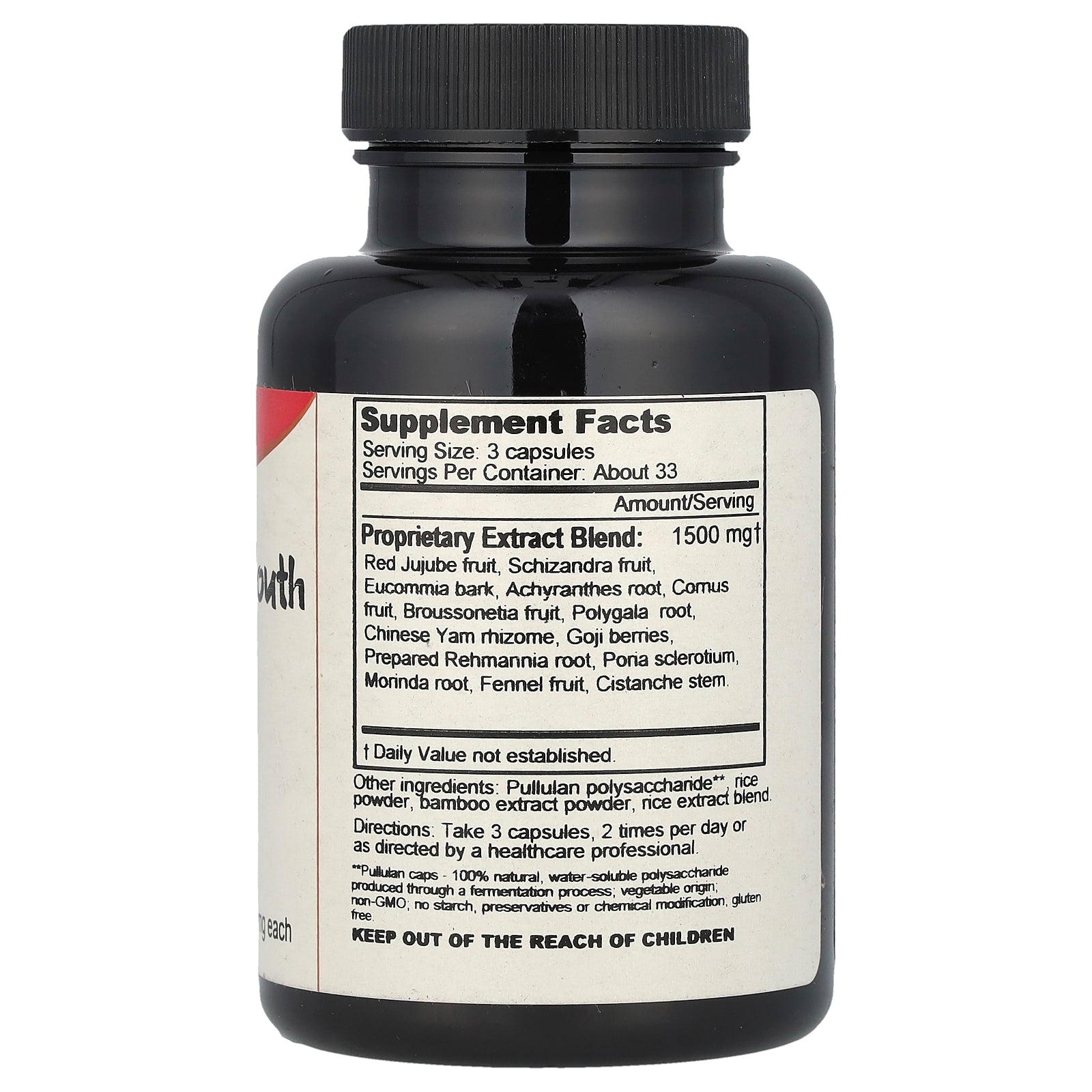 Proprietary Extract Blend: Red jujube fruit, schisandra fruit, eucommia bark, achyranthes root, comus fruit, broussonetia fruit, polygala root, Chinese yam rhizome, goji berries, prepared rehmannia root, poria sclerotium, morinda root, fennel fruit, cistanche stem. |